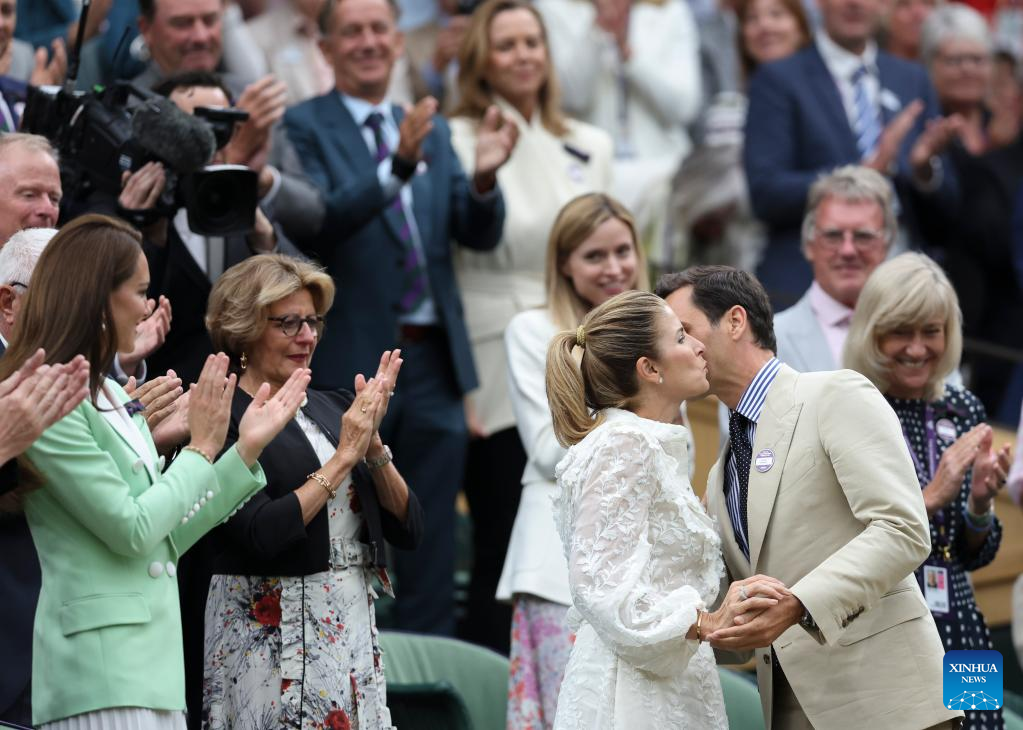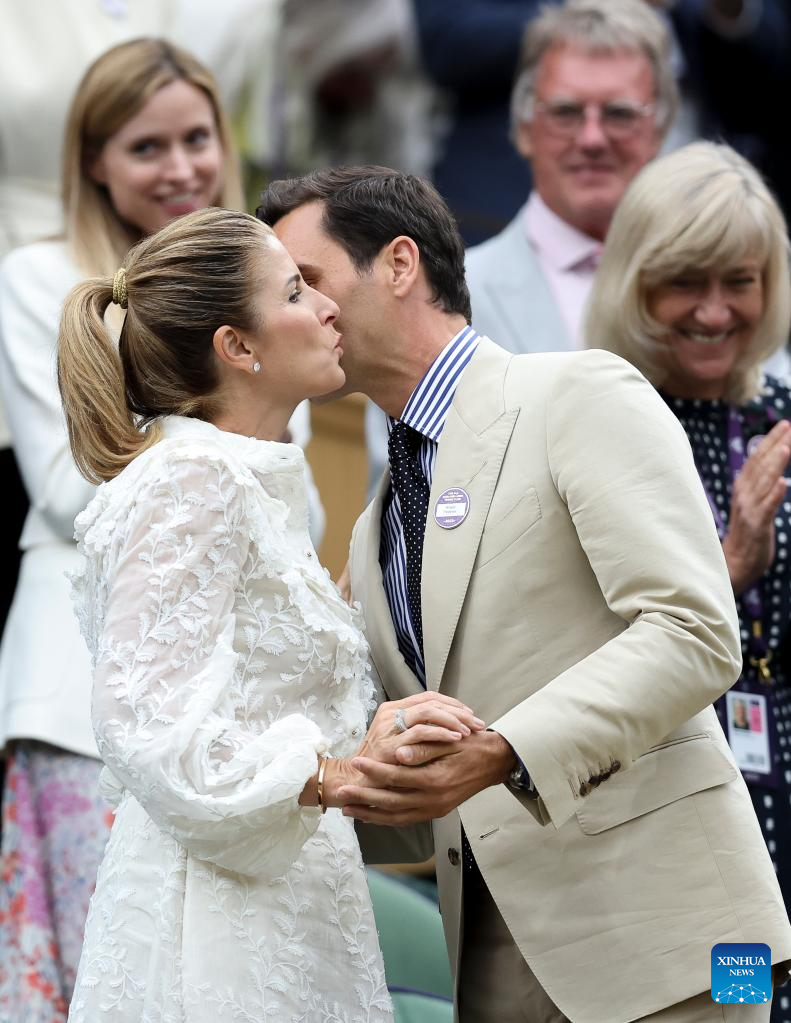 Roger Federer (front R) kisses his wife Mirka Federer (front L) at Centre Court ahead of play on Day 2 of Wimbledon Tennis Championships in London, Britain, July 4, 2023. (Xinhua/Han Yan)