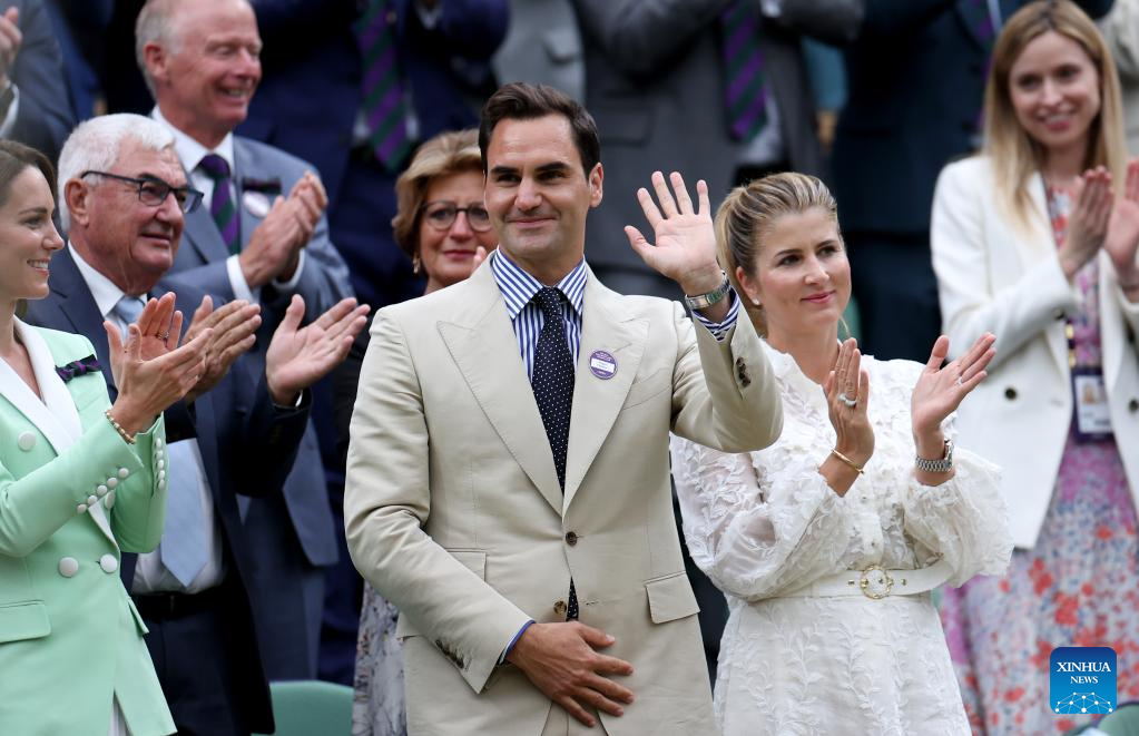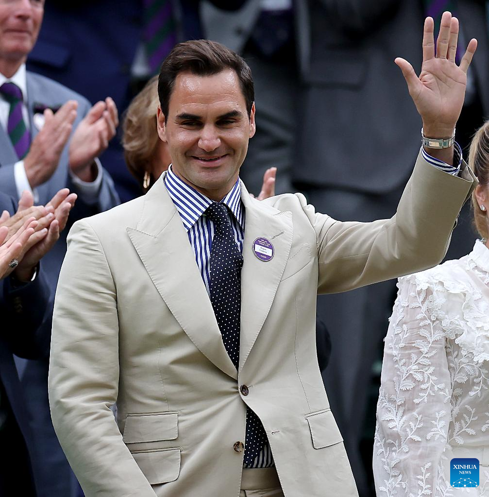 Roger Federer waves to the spectators at Centre Court ahead of play on Day 2 of Wimbledon Tennis Championships in London, Britain, July 4, 2023. (Xinhua/Li Ying)