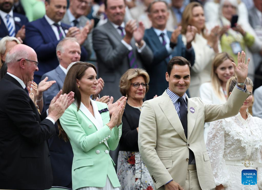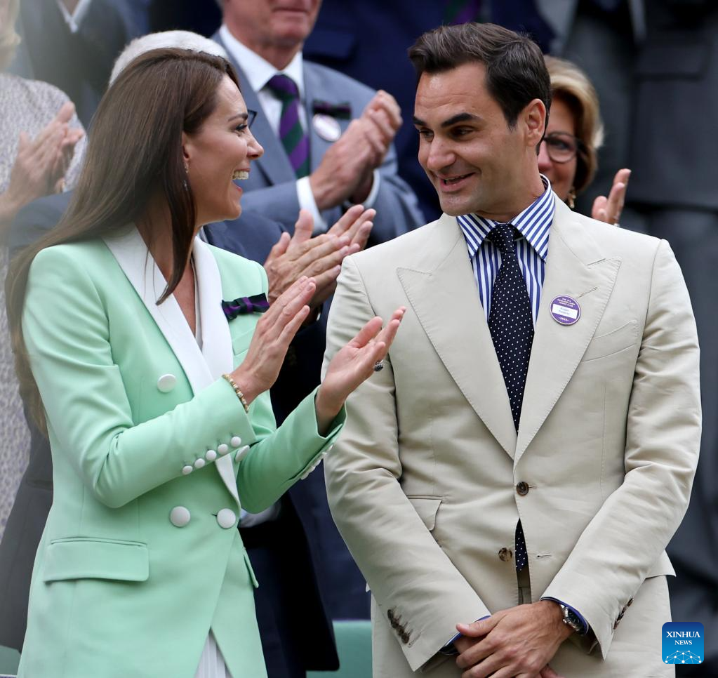 Roger Federer (front R) talks to Britain's Catherine (front C), Princess of Wales, at Centre Court ahead of play on Day 2 of Wimbledon Tennis Championships in London, Britain, July 4, 2023. (Xinhua/Han Yan)