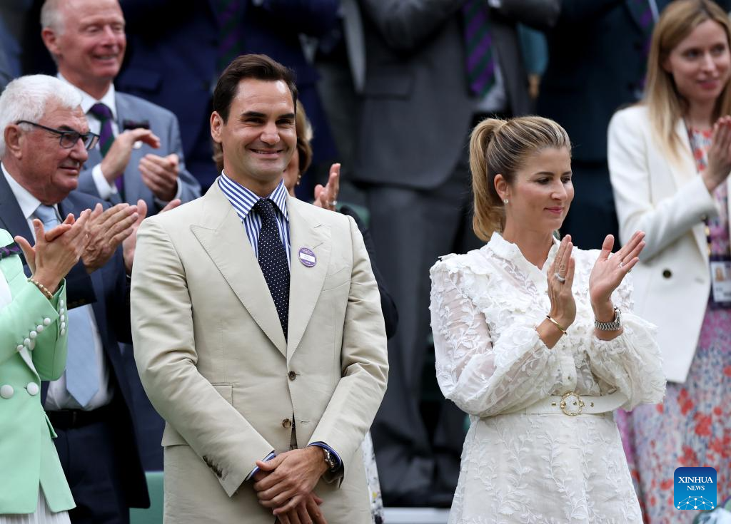 Roger Federer (L) stands with his wife Mirka Federer at Centre Court ahead of play on Day 2 of Wimbledon Tennis Championships in London, Britain, July 4, 2023. (Xinhua/Li Ying)