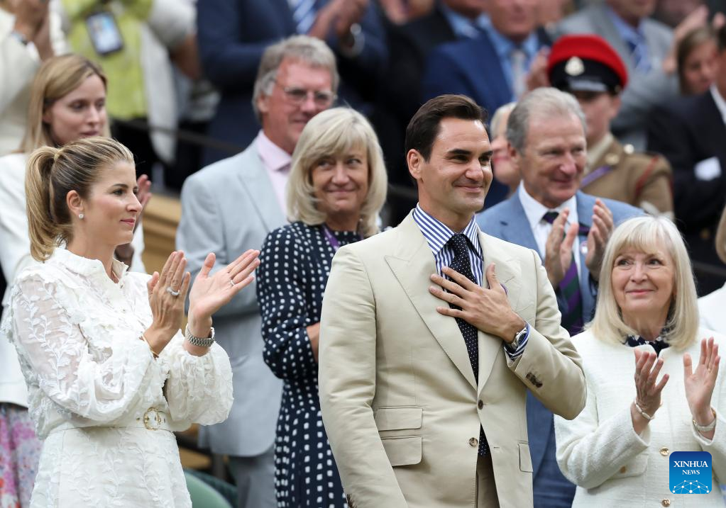 Roger Federer is seen at Centre Court ahead of play on Day 2 of Wimbledon Tennis Championships in London, Britain, July 4, 2023. (Xinhua/Li Ying)