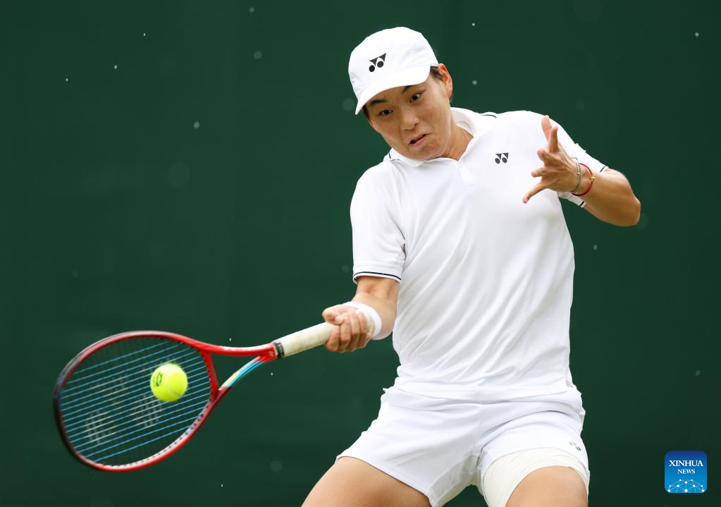 Bai Zhuoxuan hits a return during the women's singles first round match between Bai Zhuoxuan of China and Ysaline Bonaventure of Belgium at Wimbledon Tennis Championships in London, Britain, July 4, 2023. (Xinhua/Li Ying)
