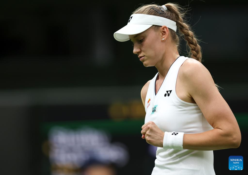 Elena Rybakina reacts during the women's singles first round match between Shelby Rogers of the United States and Elena Rybakina of Kazakhstan at Wimbledon Tennis Championships in London, Britain, July 4, 2023. (Xinhua/Han Yan)