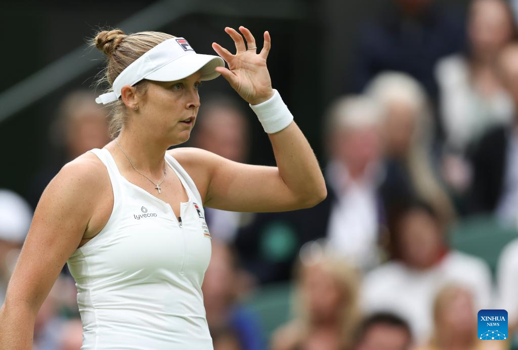 Shelby Rogers reacts during the women's singles first round match between Shelby Rogers of the United States and Elena Rybakina of Kazakhstan at Wimbledon Tennis Championships in London, Britain, July 4, 2023. (Xinhua/Han Yan)