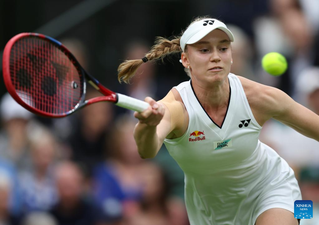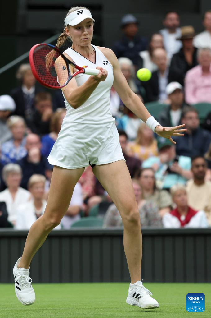 Elena Rybakina hits a return during the women's singles first round match between Shelby Rogers of the United States and Elena Rybakina of Kazakhstan at Wimbledon Tennis Championships in London, Britain, July 4, 2023. (Xinhua/Han Yan)