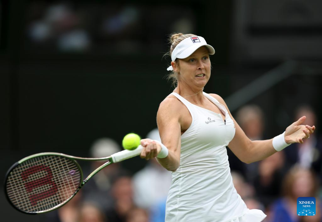 Shelby Rogers hits a return during the women's singles first round match between Shelby Rogers of the United States and Elena Rybakina of Kazakhstan at Wimbledon Tennis Championships in London, Britain, July 4, 2023. (Xinhua/Han Yan)