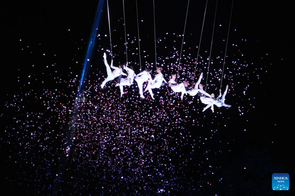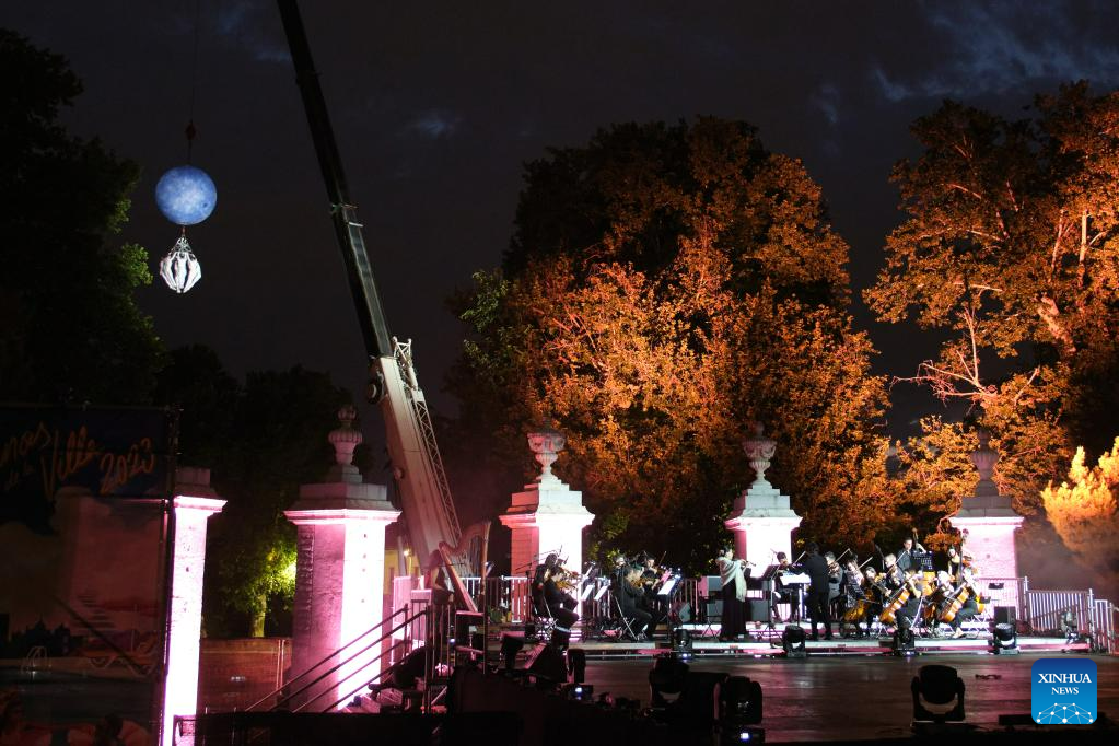 Dancers of Aerial Strada and Verum Symphony Orchestra perform on the King's Bridge in Madrid, Spain, on July 5, 2023. The aerial ballet "Sylphes" is staged to kick off the 39th Veranos de la Villa festival in Madrid. (Xinhua/Meng Dingbo)