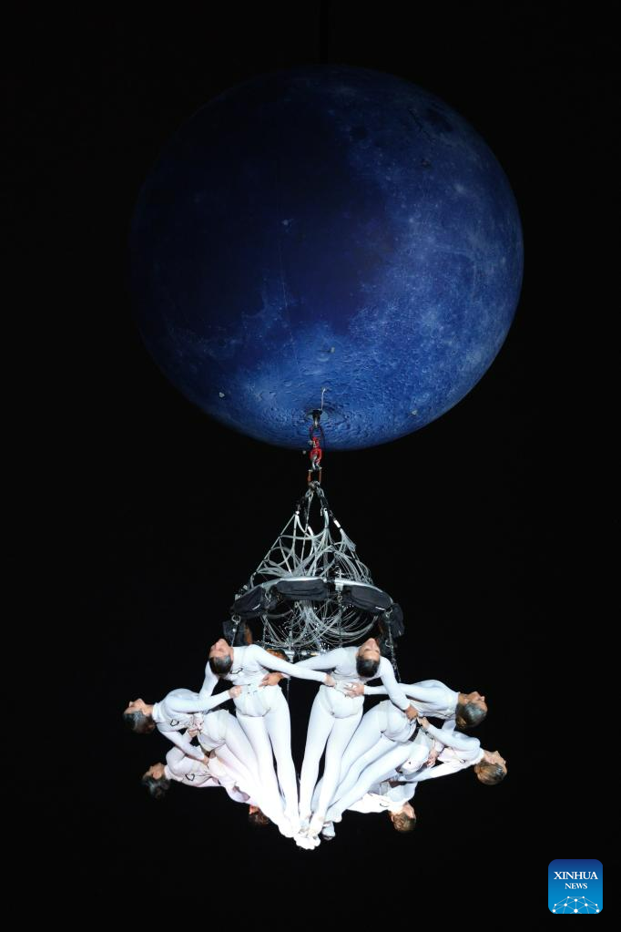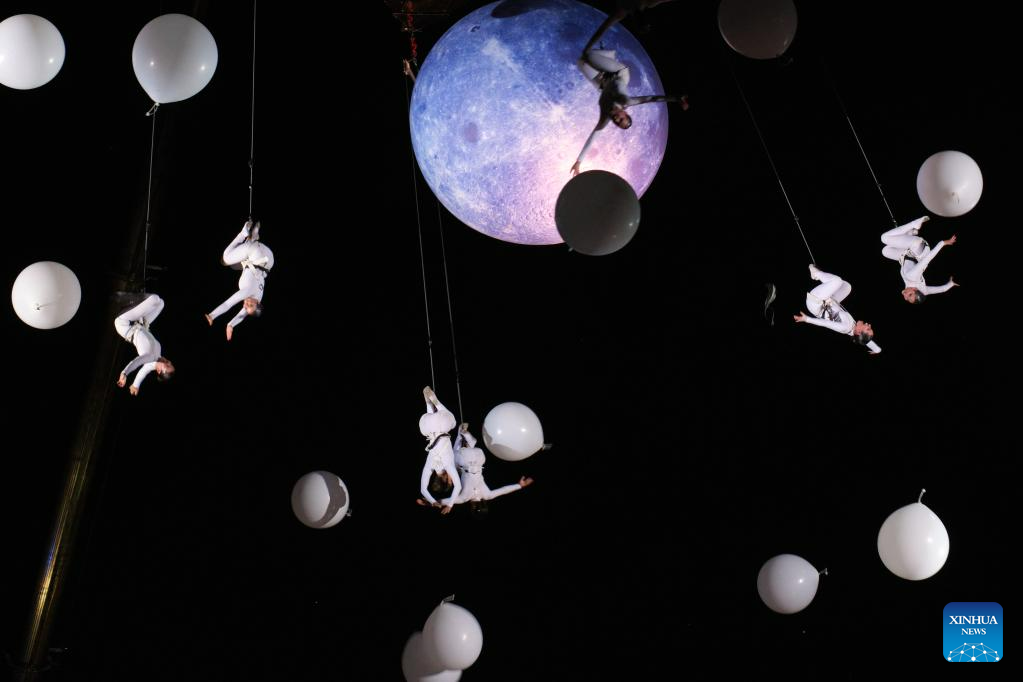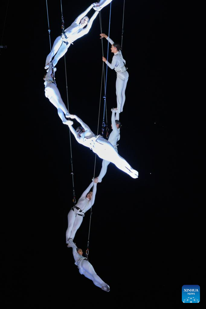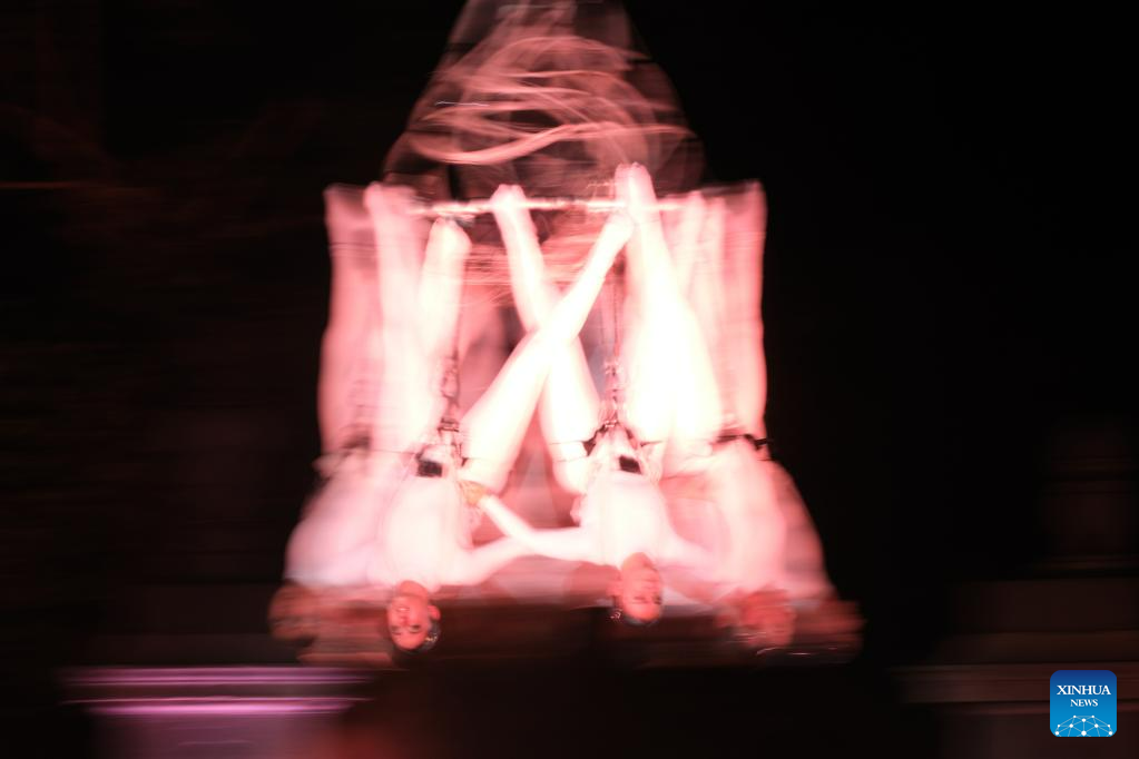 Dancers of Aerial Strada perform on the King's Bridge in Madrid, Spain, on July 5, 2023. The aerial ballet "Sylphes" is staged to kick off the 39th Veranos de la Villa festival in Madrid. (Xinhua/Meng Dingbo)