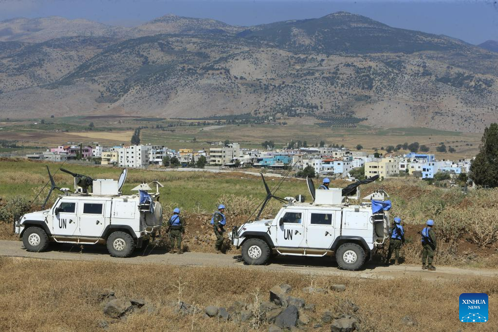 UNIFIL soldiers patrol along a road near the Lebanese-Israeli border in the town of Al-Wazzani, Lebanon, on July 6, 2023. (Photo by Ali Hashisho/Xinhua)