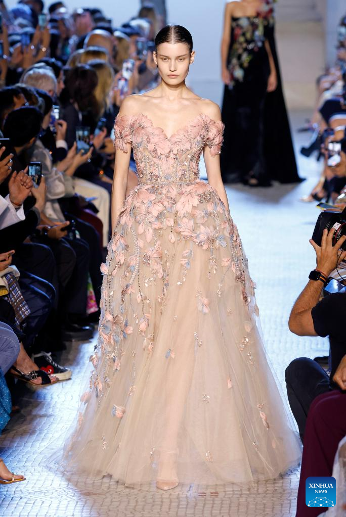 A model presents a creation of Elie Saab's Autumn/Winter 2023/2024 Haute Couture collections during Paris Fashion Week in Paris, France, July 5, 2023. (MeetEurope/Handout via Xinhua)