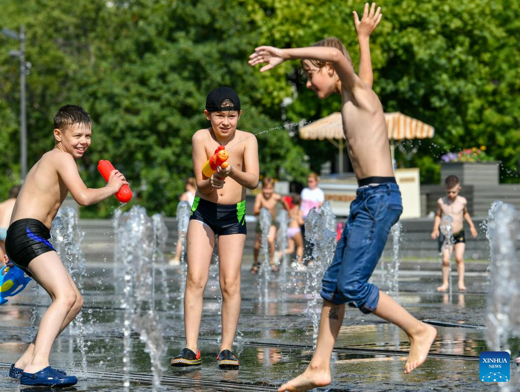 Children play at a fountain in Moscow, Russia, on July 6, 2023. (Xinhua/Cao Yang)