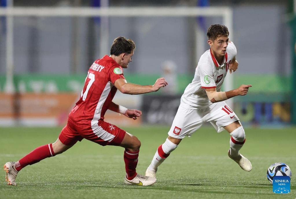 Poland's Kacper Urbanski (R) vies with Malta's Daniel Letherby during the UEFA Under-19 EURO championship final tournament Group A football match between Poland and Malta at the Centenary Stadium, in Ta'Qali, Malta, on July 6, 2023. (Photo by Jonathan Borg/Xinhua)