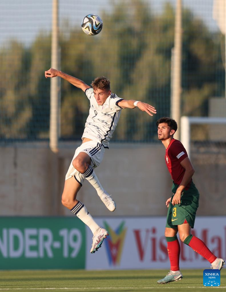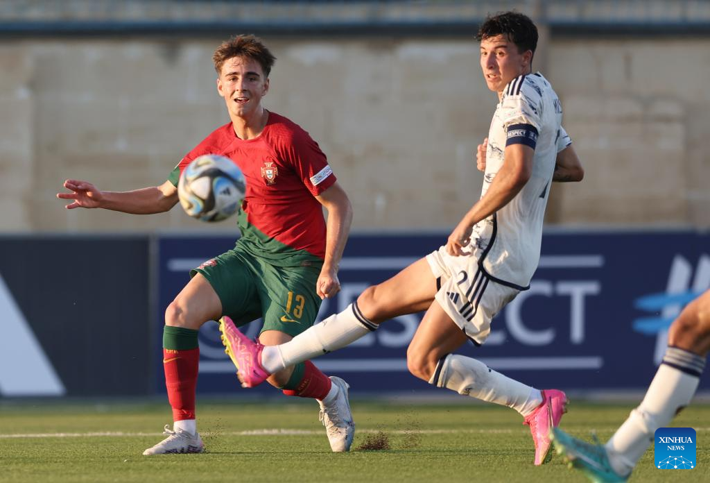 Portugal's Hugo Felix (R) vies with Italy's Iacopo Regonesi during the UEFA Under-19 EURO championship final tournament Group A football match between Portugal and Italy at the Centenary Stadium, in Ta'Qali, Malta, on July 6, 2023. (Photo by Jonathan Borg/Xinhua)