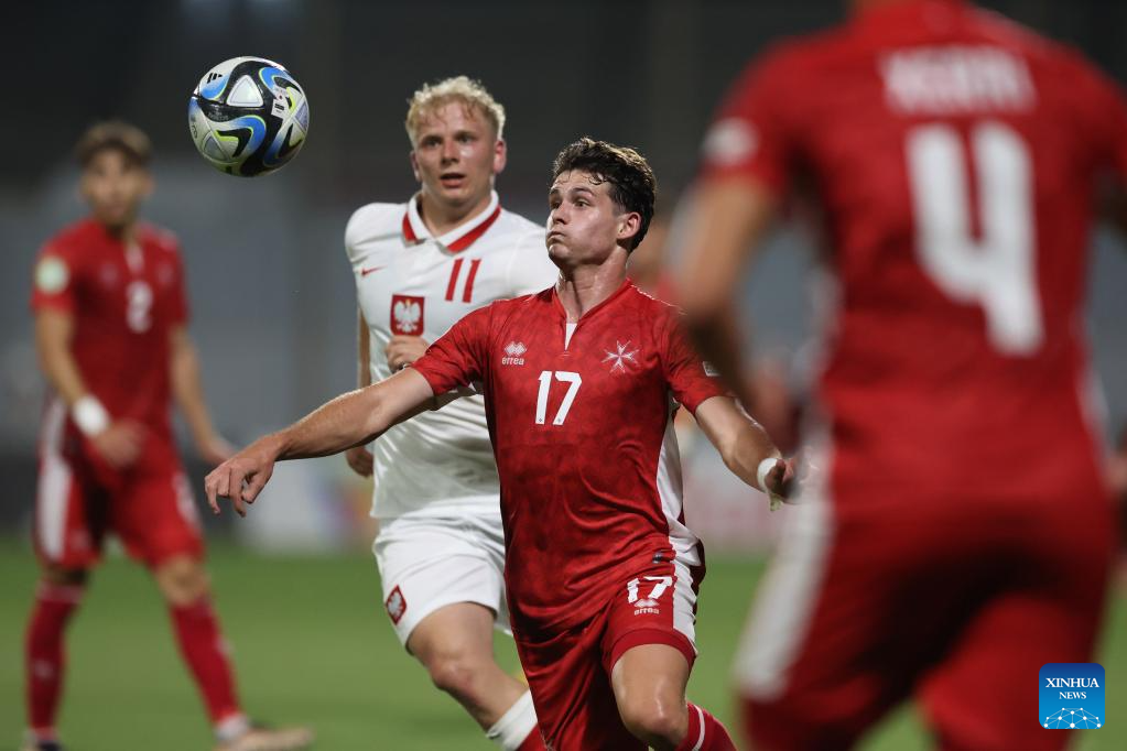 Poland's Igor Strzalek (R) vies with Malta's Tristan Viviani during the UEFA Under-19 EURO championship final tournament Group A football match between Poland and Malta at the Centenary Stadium, in Ta'Qali, Malta, on July 6, 2023. (Photo by Jonathan Borg/Xinhua)