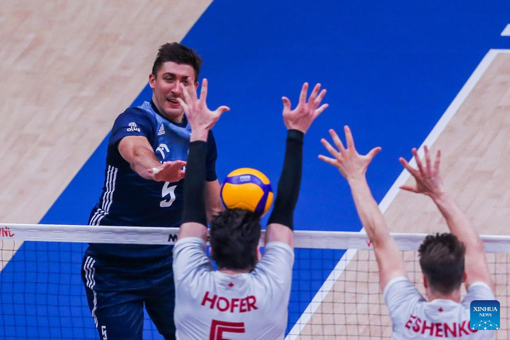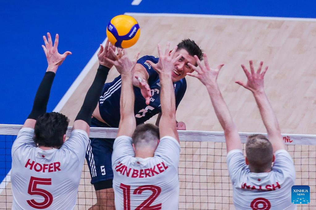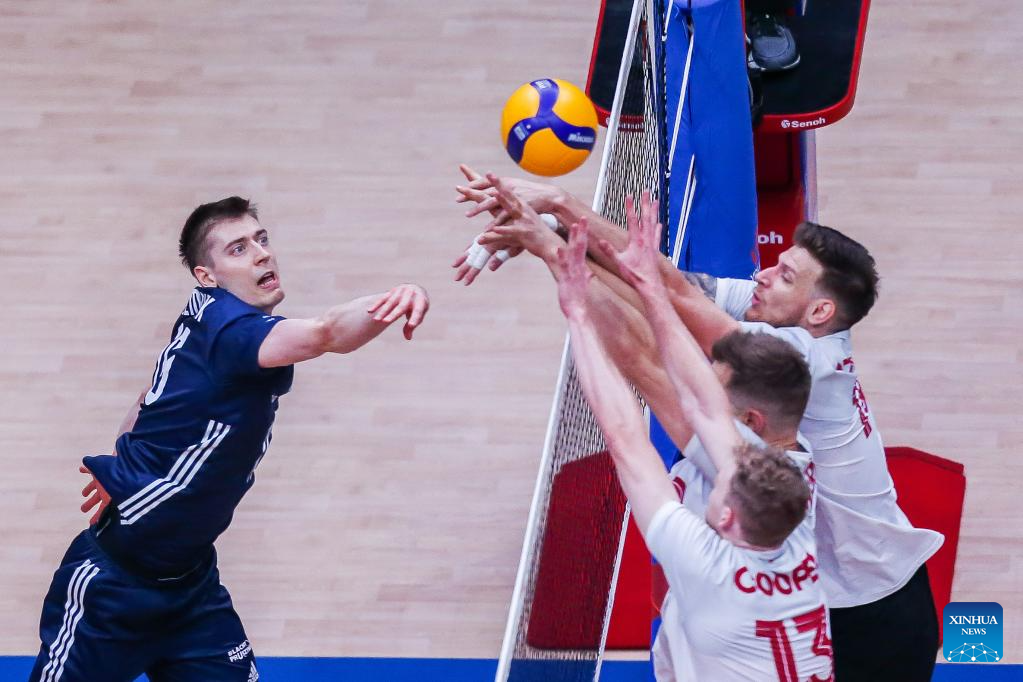 Lukasz Kaczmarek (L) of Poland competes during the Pool 6 match between Poland and Canada at the Men's Volleyball Nations League in Pasay City, the Philippines, July 8, 2023. (Xinhua/Rouelle Umali)