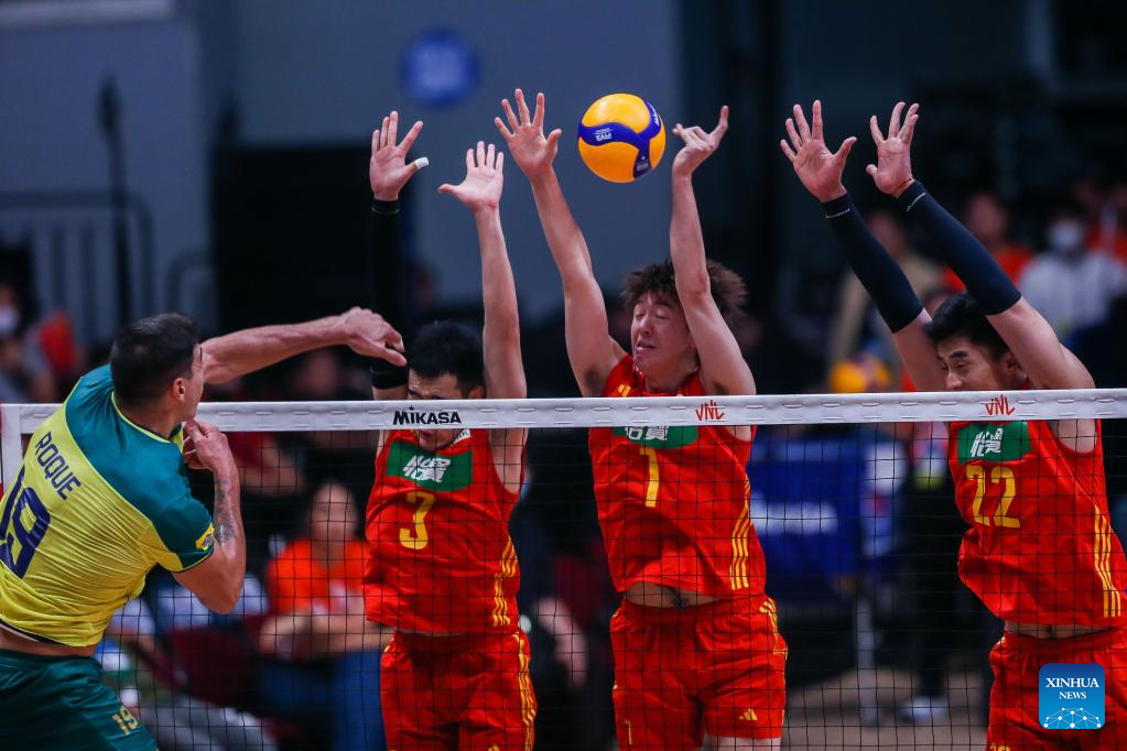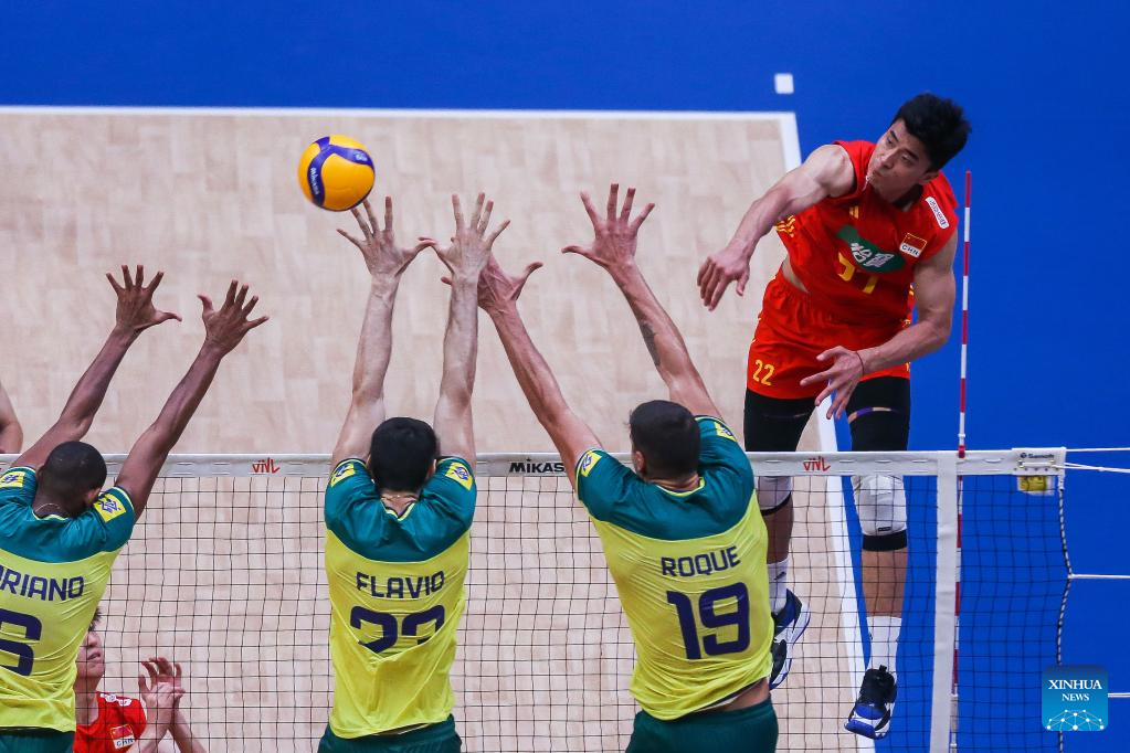 Zhang Jingyin of China (1st R) competes against players of Brazil during their pool 6 match in the Volleyball Nations League in Pasay City, the Philippines, on July 8, 2023. (Photo by Rouelle Umali/Xinhua)