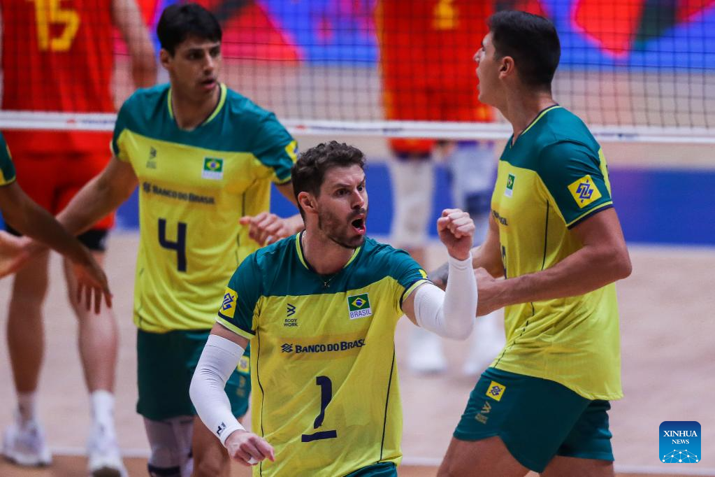 Rezende Bruno Mossa of Brazil (C) celebrates after scoring a point against China during their pool 6 match in the Volleyball Nations League in Pasay City, the Philippines, on July 8, 2023. (Photo by Rouelle Umali/Xinhua)