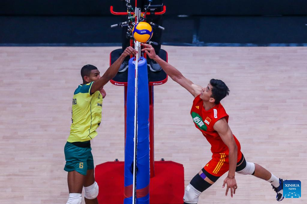 Peng Shikun of China (R) competes against Resende Gualberto Flavio of Brazil (L) during their pool 6 match in the Volleyball Nations League in Pasay City, the Philippines, on July 8, 2023. (Photo by Rouelle Umali/Xinhua)