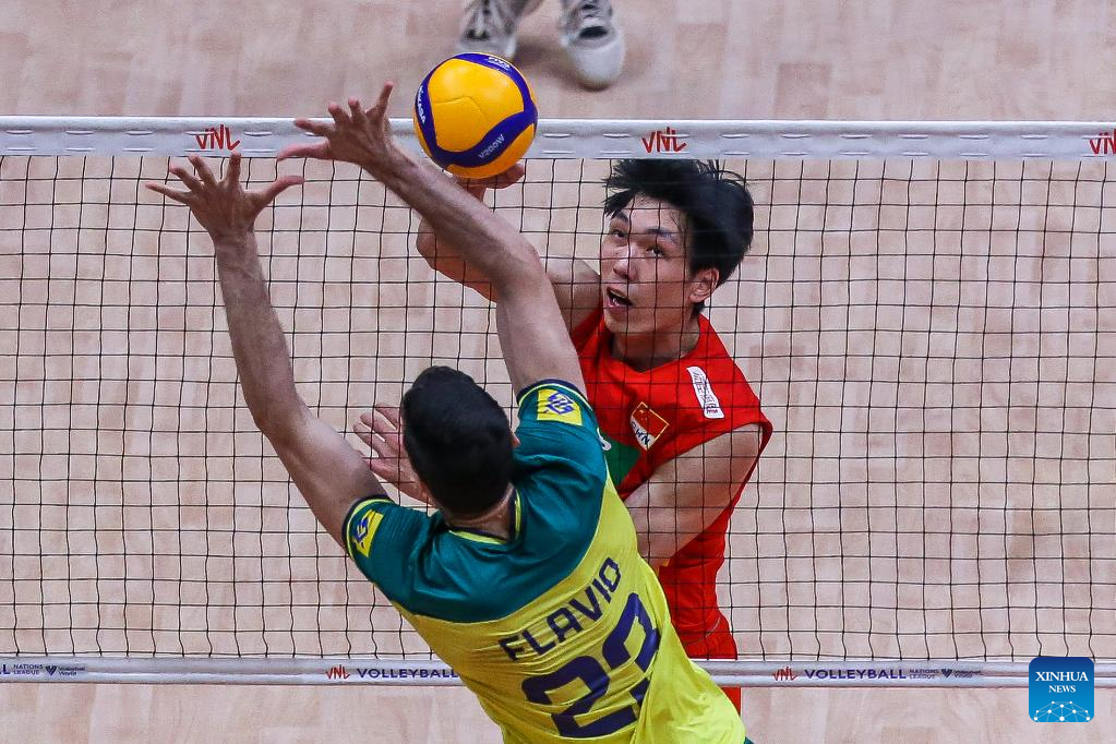 Zhang Jingyin of China (R) competes against Fernandes P.X.Cavalcante Adriano of Brazil during their pool 6 match in the Volleyball Nations League in Pasay City, the Philippines, on July 8, 2023. (Photo by Rouelle Umali/Xinhua)