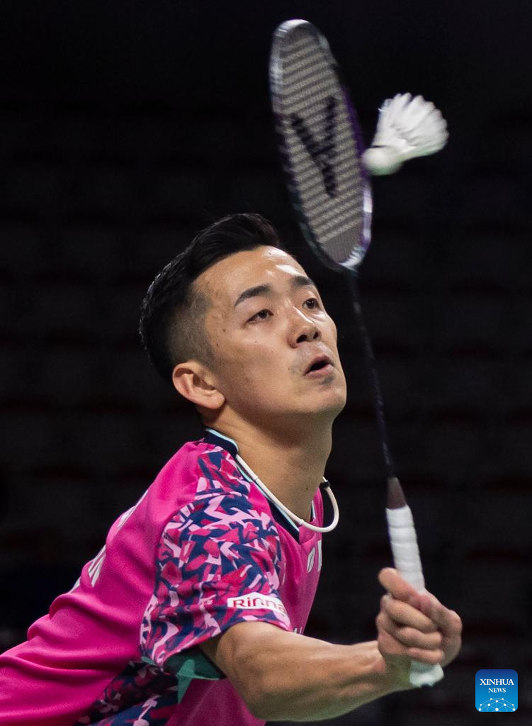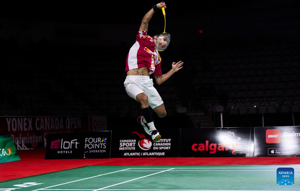 Nishimoto Kenta of Japan returns a shot during the semifinals of men's singles match against Lakshya Sen of India at the 2023 Canada Open in Calgary, Canada, on July 8, 2023. (Photo by Zou Zheng/Xinhua)