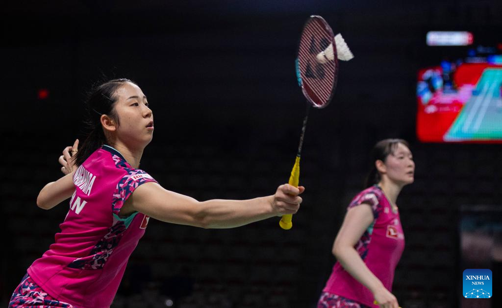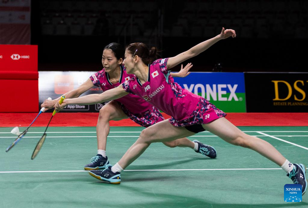 Matsuyama Nami (back)/Shida Chiharu of Japan compete during the semifinals of women's doubles match between Matsuyama Nami/Shida Chiharu of Japan and Fukushima Yuki/Hirota Sayaka of Japan at the 2023 Canada Open in Calgary, Canada, on July 8, 2023. (Photo by Zou Zheng/Xinhua)