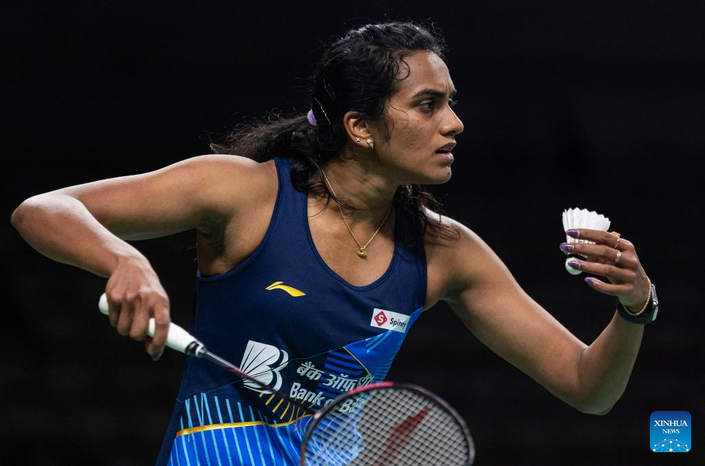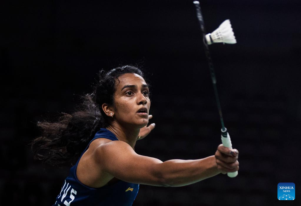 Pusarla Venkata Sindhu of India returns a shot during the semifinals of women's singles match against Yamaguchi Akane of Japan at the 2023 Canada Open in Calgary, Canada, on July 8, 2023. (Photo by Zou Zheng/Xinhua)