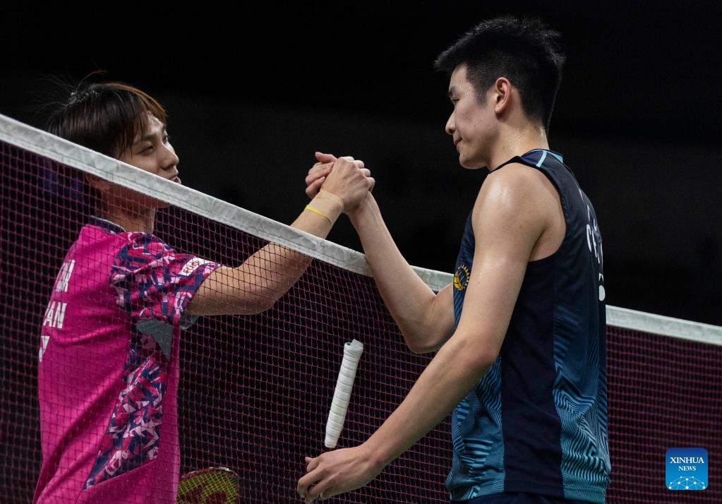 Li Shifeng (R) of China greets Naraoka Kodai of Japan after their semifinals of men's singles match at the 2023 Canada Open badminton tourment in Calgary, Canada, on July 8, 2023. (Photo by Zou Zheng/Xinhua)