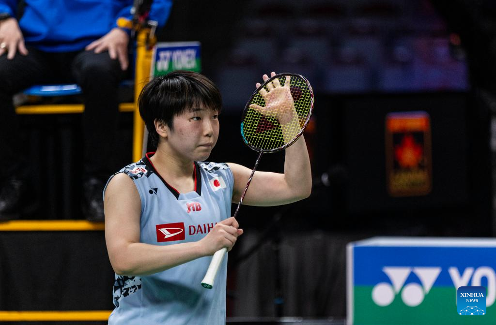 Yamaguchi Akane of Japan celebrates after winning the semifinals of women's singles match against Pusarla Venkata Sindhu of India at the 2023 Canada Open in Calgary, Canada, on July 8, 2023. (Photo by Zou Zheng/Xinhua)