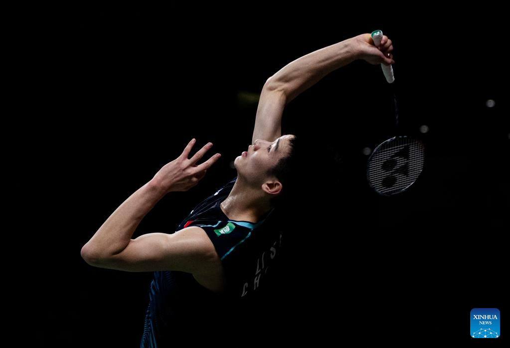 Li Shifeng of China returns a shot during the semifinals of men's singles match against Naraoka Kodai of Japan at the 2023 Canada Open badminton tourment in Calgary, Canada, on July 8, 2023. (Photo by Zou Zheng/Xinhua)