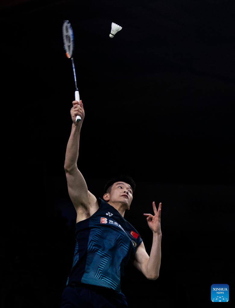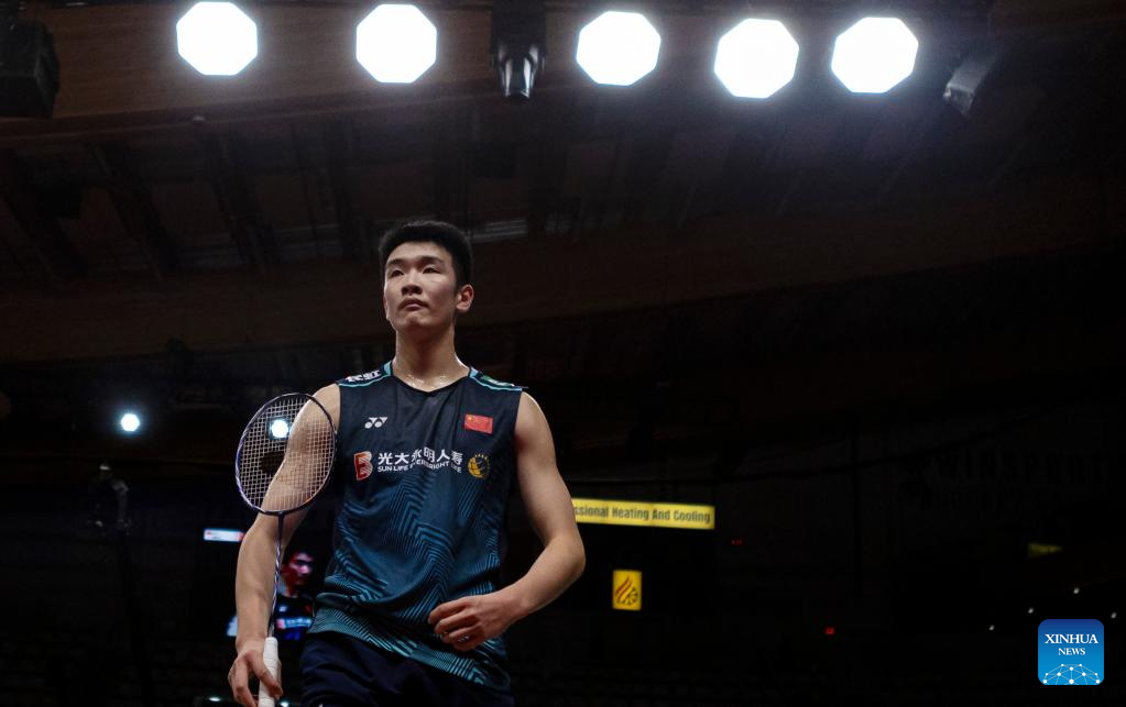 Li Shifeng of China reacts during the semifinals of men's singles match against Naraoka Kodai of Japan at the 2023 Canada Open badminton tourment in Calgary, Canada, on July 8, 2023. (Photo by Zou Zheng/Xinhua)