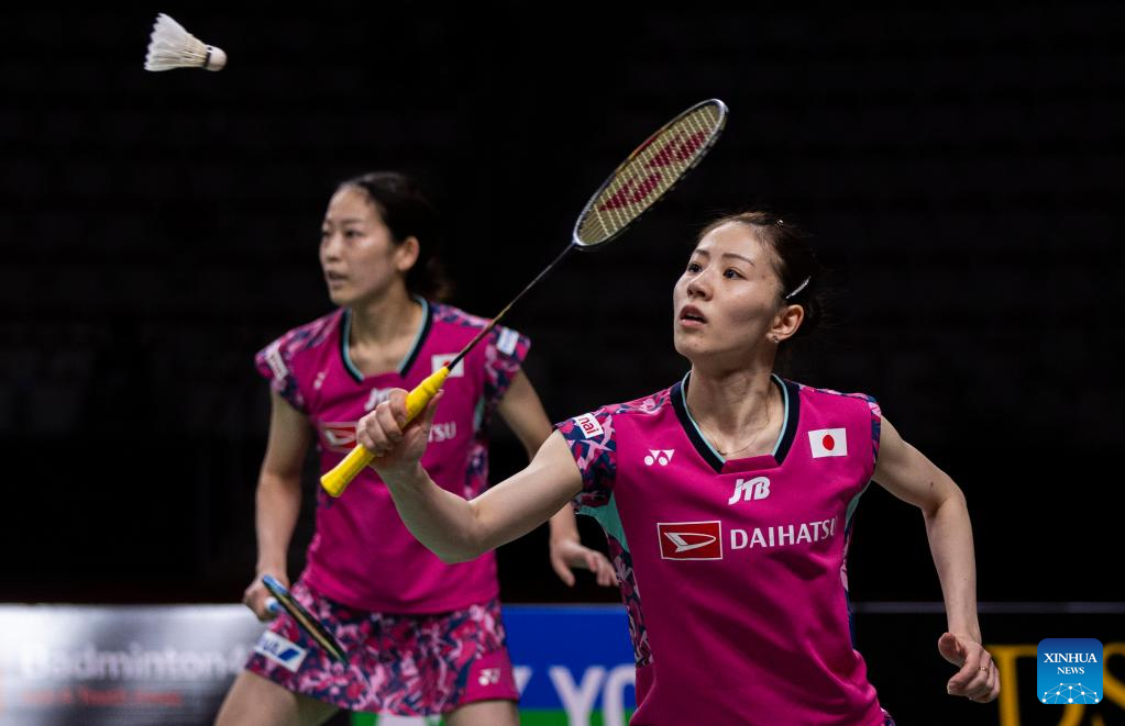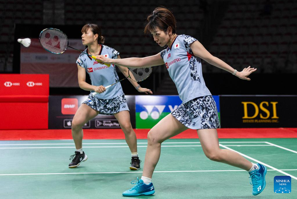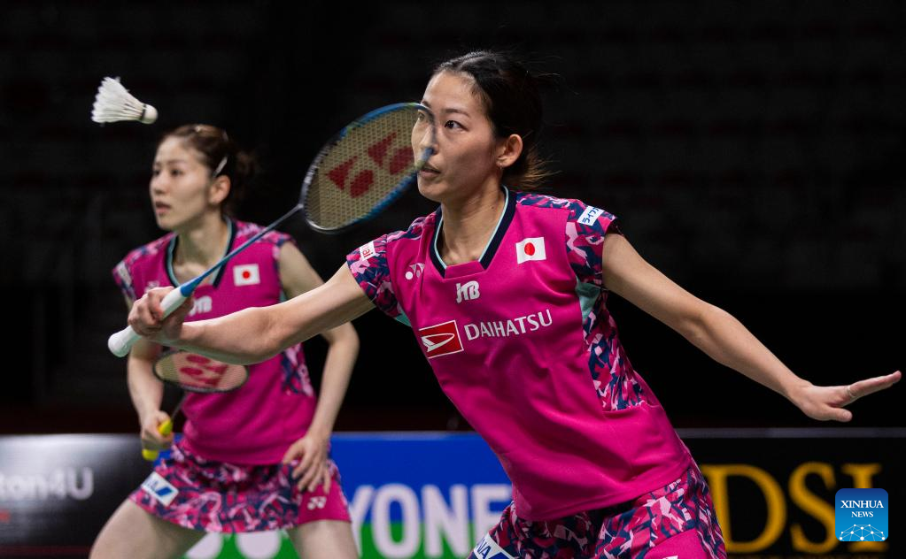 Fukushima Yuki/Hirota Sayaka (R) of Japan compete during the semifinals of women's doubles match between Matsuyama Nami/Shida Chiharu of Japan and Fukushima Yuki/Hirota Sayaka of Japan at the 2023 Canada Open in Calgary, Canada, on July 8, 2023. (Photo by Zou Zheng/Xinhua)