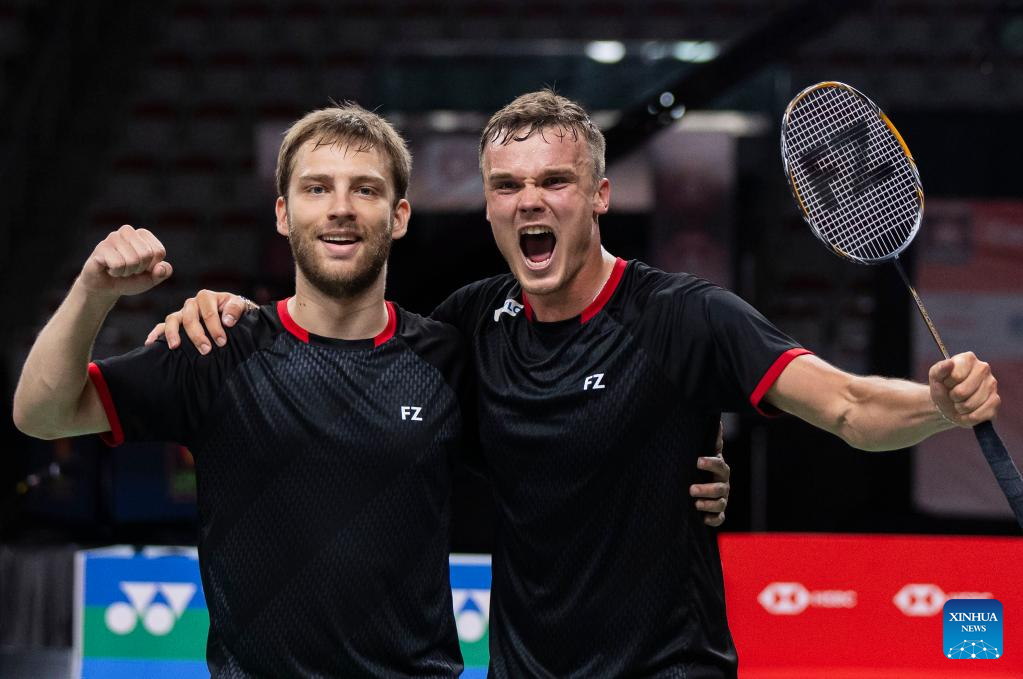 Rasmus Kjaer (L)/Frederik Sogaard of Denmark celebrate victory after the semifinals of men's doubles match between Rasmus Kjaer/Frederik Sogaard of Denmark and Koga Akira/Saito Taichi of Japan at the 2023 Canada Open in Calgary, Canada, on July 8, 2023. (Photo by Zou Zheng/Xinhua)