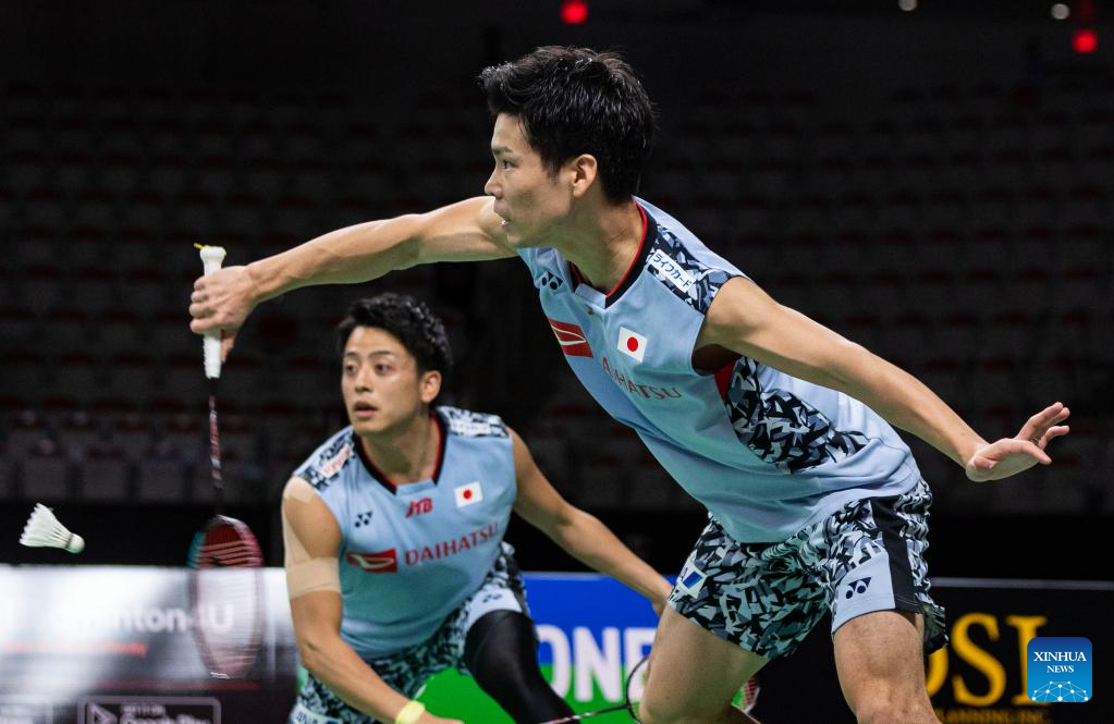 Koga Akira (L) /Saito Taichi of Japan compete during the semifinals of men's doubles match between Rasmus Kjaer/Frederik Sogaard of Denmark and Koga Akira/Saito Taichi of Japan at the 2023 Canada Open in Calgary, Canada, on July 8, 2023. (Photo by Zou Zheng/Xinhua)