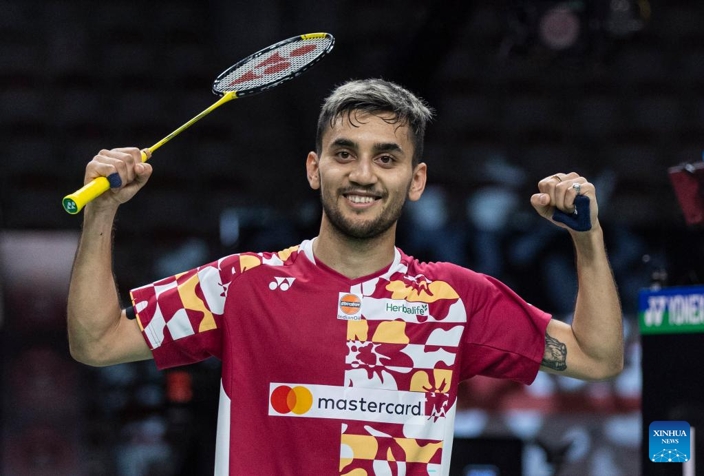 Lakshya Sen of India celebrates victory after the semifinals of men's singles match against Nishimoto Kenta of Japan at the 2023 Canada Open in Calgary, Canada, on July 8, 2023. (Photo by Zou Zheng/Xinhua)
