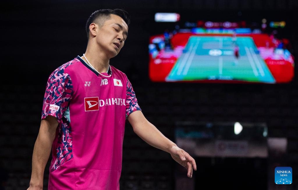 Nishimoto Kenta of Japan reacts during the semifinals of men's singles match against Lakshya Sen of India at the 2023 Canada Open in Calgary, Canada, on July 8, 2023. (Photo by Zou Zheng/Xinhua)