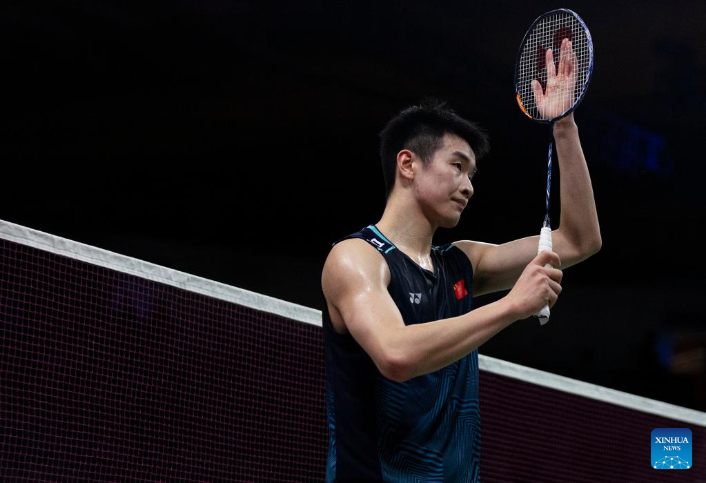 Li Shifeng of China celebrates after the semifinals of men's singles match against Naraoka Kodai of Japan at the 2023 Canada Open badminton tourment in Calgary, Canada, on July 8, 2023. (Photo by Zou Zheng/Xinhua)