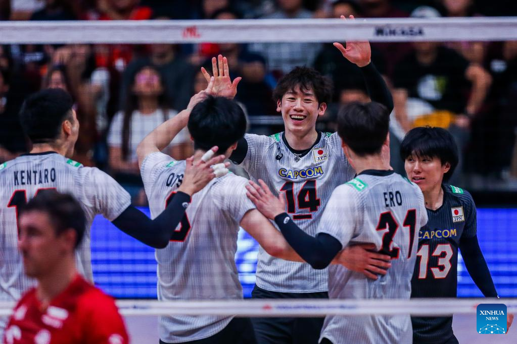 Players from Japan celebrate after scoring a point during the Pool 6 match between Japan and Poland at the Men's Volleyball Nations League in Pasay City, the Philippines, July 9, 2023. (Xinhua/Rouelle Umali)