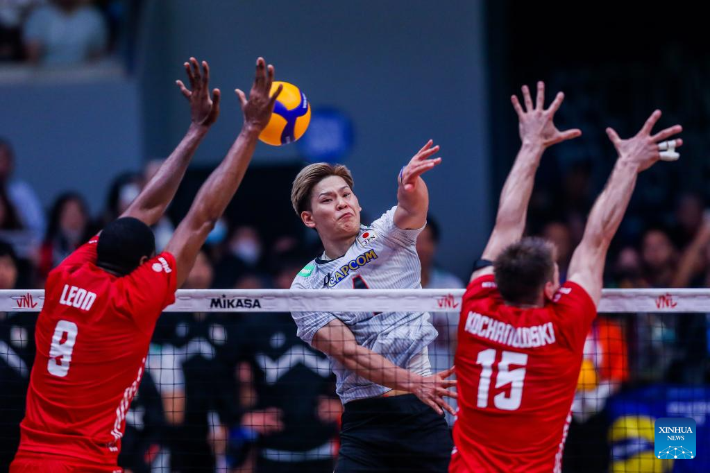 Nishida Yuji (C) of Japan spikes the ball during the Pool 6 match between Japan and Poland at the Men's Volleyball Nations League in Pasay City, the Philippines, July 9, 2023. (Xinhua/Rouelle Umali)