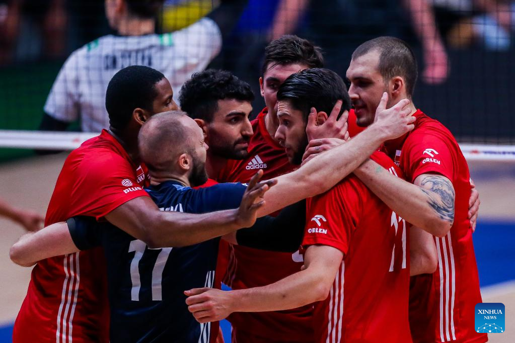 Players from Poland celebrate after scoring a point during the Pool 6 match between Japan and Poland at the Men's Volleyball Nations League in Pasay City, the Philippines, July 9, 2023. (Xinhua/Rouelle Umali)