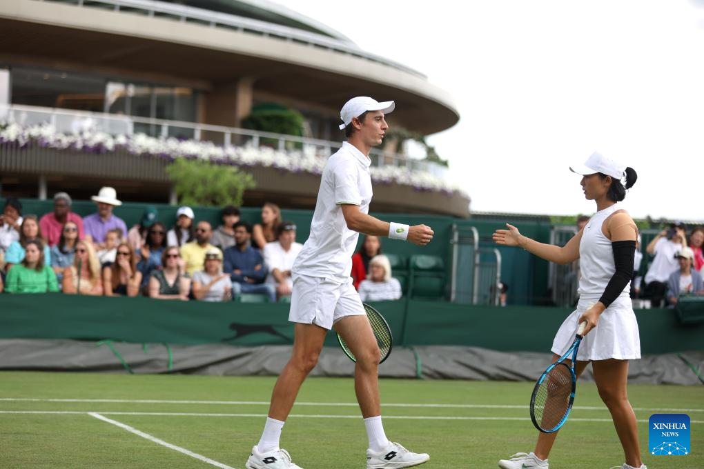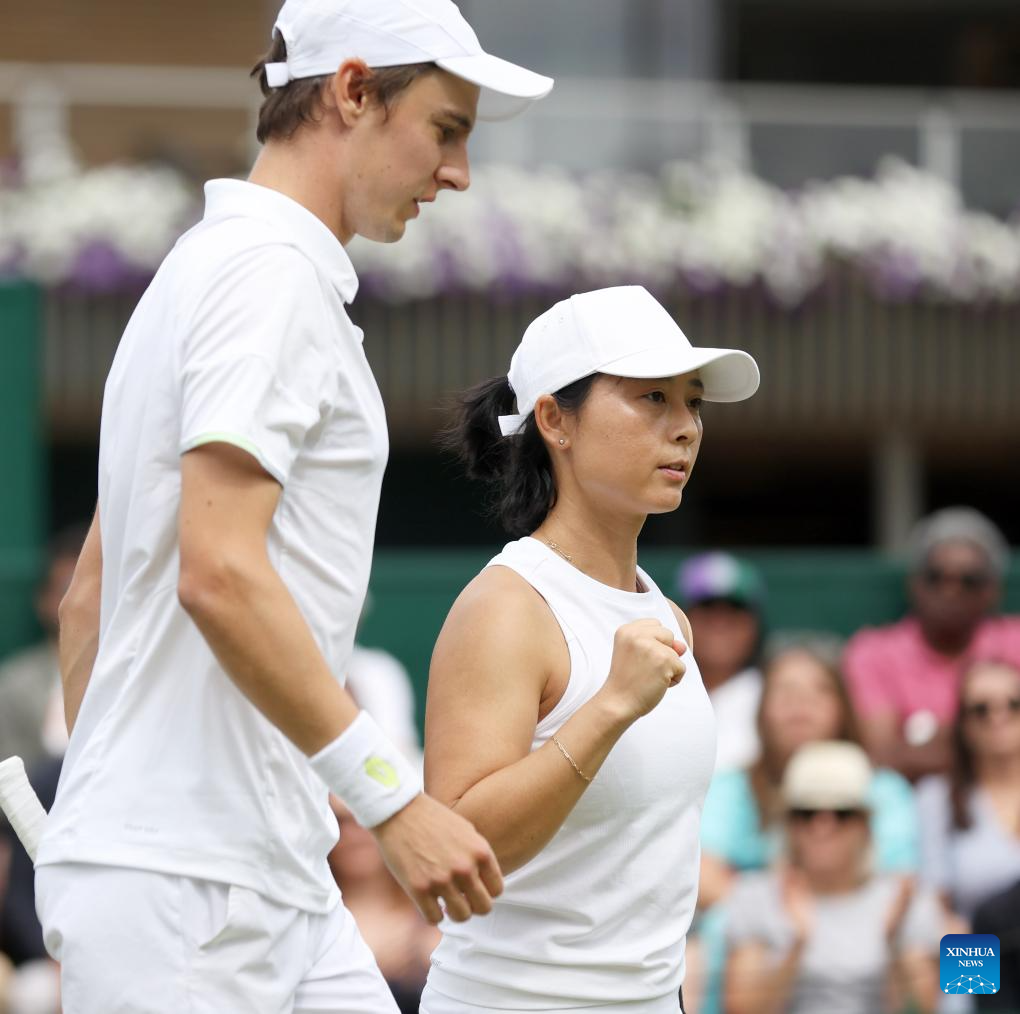 Xu Yifan (R)/Joran Vliegen compete during the mixed doubles semifinal match between Xu Yifan (China)/Joran Vliegen (Belgium) and Matwe Middelkoop (the Netherlands)/Aldila Sutjiadi (Indonesia) at Wimbledon tennis Championship in London, Britain, July 12, 2023. (Xinhua/Li Ying)