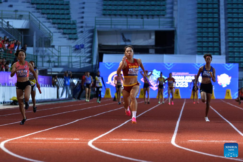 Ge Manqi (front) of China sprints during the women's 4X100 meters relay final at the 25th Asian Athletics Championships in Bangkok, Thailand, July 12, 2023. (Xinhua/Rachen Sageamsak)