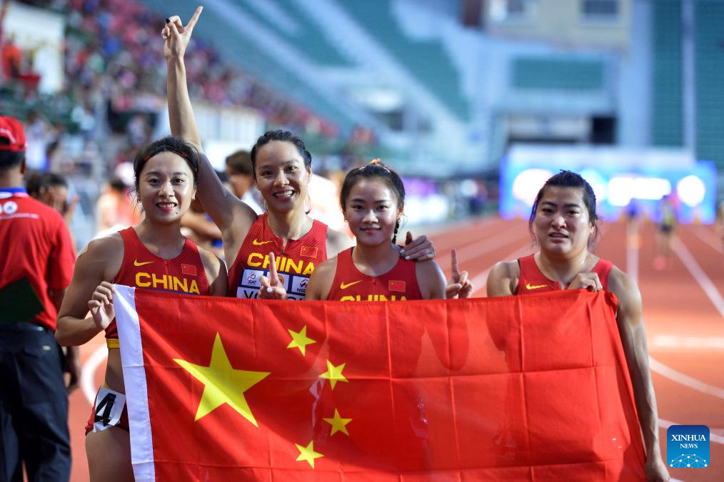 Gold medalists Ge Manqi, Wei Yongli, Liang Xiaojing and Yuan Qiqi (from L to R) of China pose after the women's 4X100 meters relay final at the 25th Asian Athletics Championships in Bangkok, Thailand, July 12, 2023. (Xinhua/Rachen Sageamsak)
