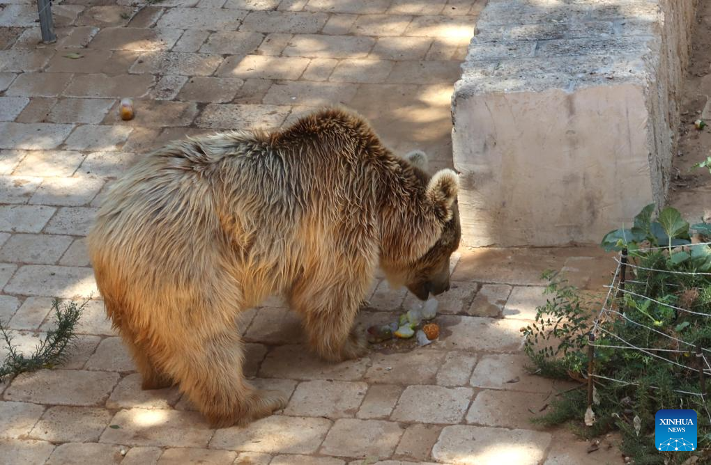 A Syrian brown bear eats frozen food during heat wave at Israel's Safari Zoo in central Israeli city of Ramat Gan on July 13, 2023. (Photo by Gil Cohen Magen/Xinhua)