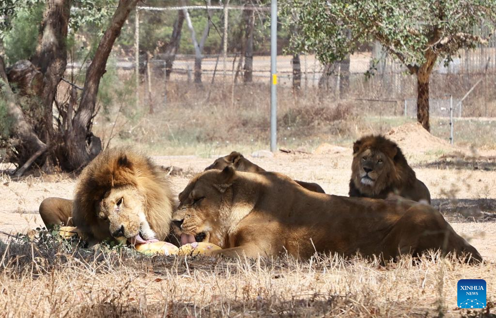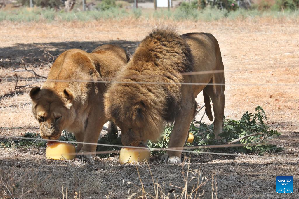 Lions eat frozen food at Israel's Safari Zoo during heat wave in central Israeli city of Ramat Gan on July 13, 2023. (Photo by Gil Cohen Magen/Xinhua)
