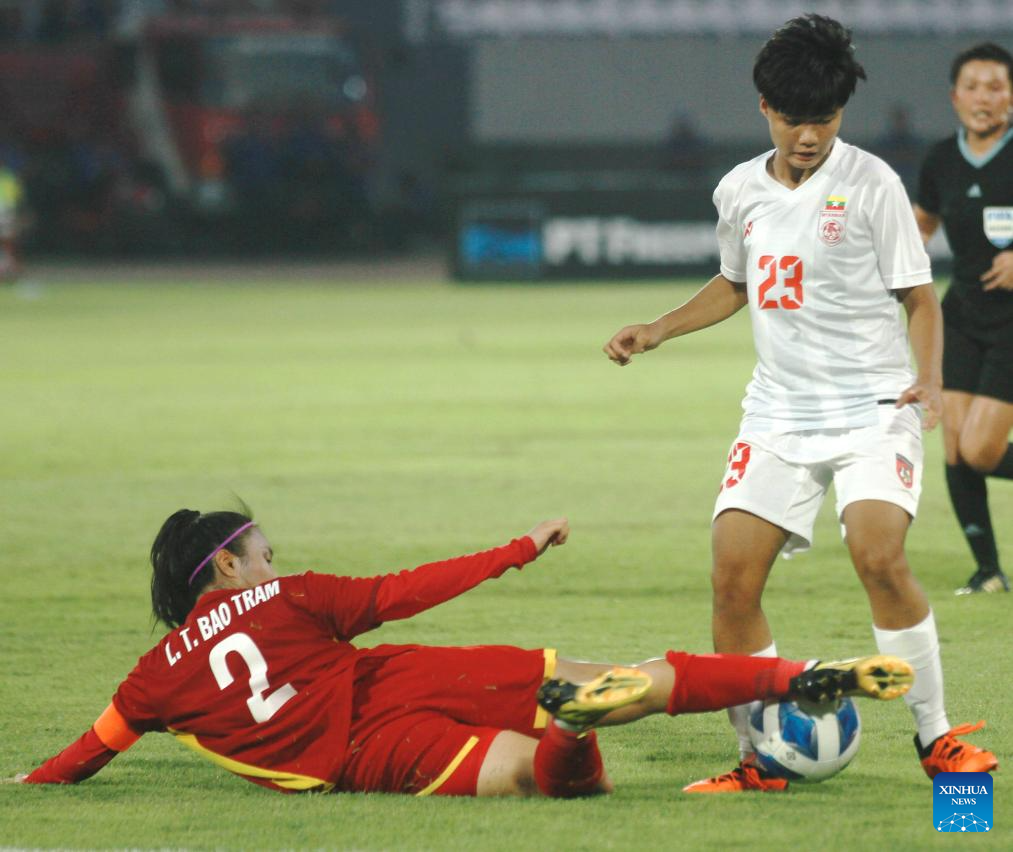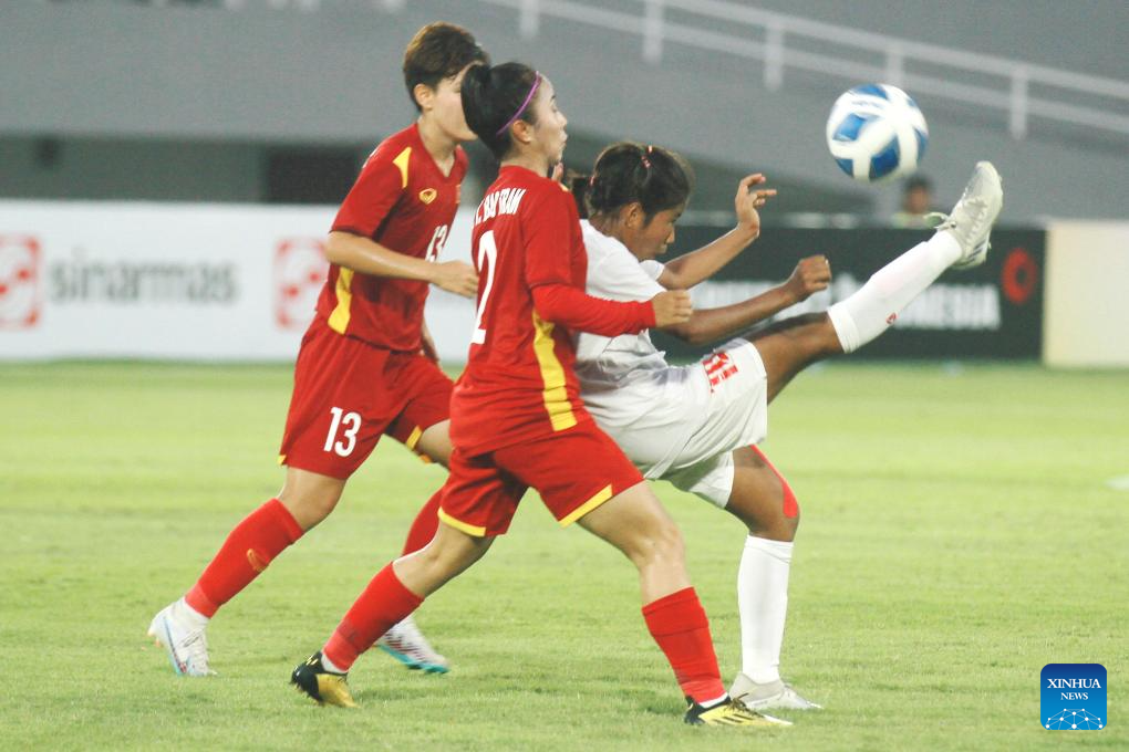 Yin Loon Eain (1st R) of Myanmar competes during the semifinal match between Vietnam and Myanmar at ASEAN Football Federation (AFF) U-19 Women's Championship 2023 in Palembang, Indonesia, July 13, 2023. (Photo by M. Hatta/Xinhua)