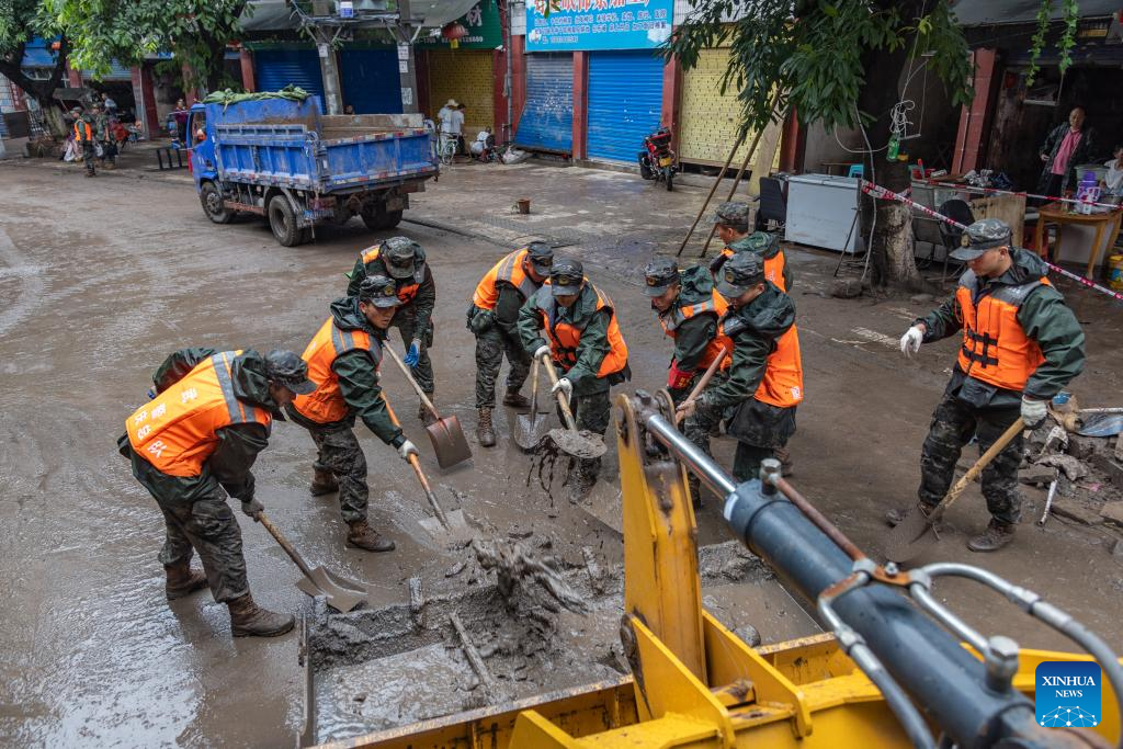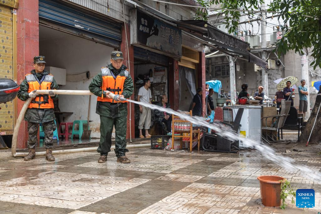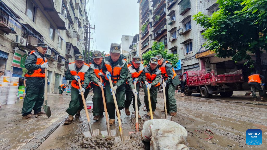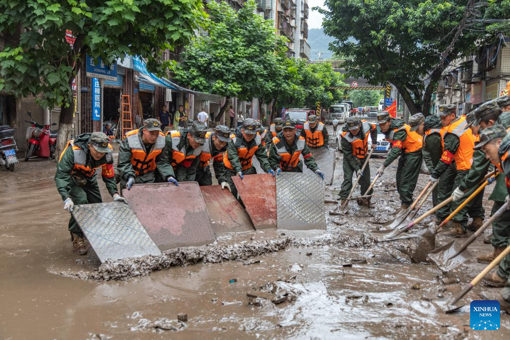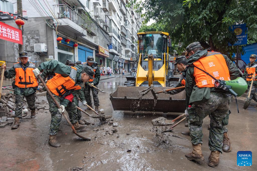 Rescuers clean a flooded street in Wanzhou District, southwest China's Chongqing Municipality, July 14, 2023. Rainstorms have battered 28 districts and counties of Chongqing since Thursday, with a record-breaking maximum daily rainfall of 227 mm recorded in the Wanzhou District, according to the local meteorological service.
