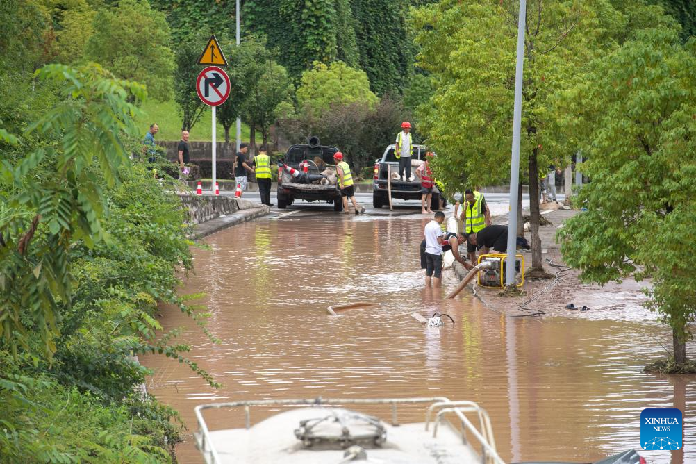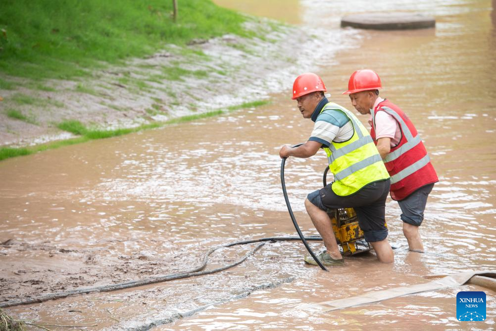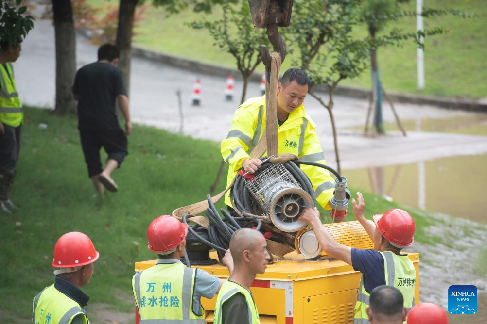 Rescuers work to drain a flooded road in Wanzhou District, southwest China's Chongqing Municipality, July 14, 2023. Rainstorms have battered 28 districts and counties of Chongqing since Thursday, with a record-breaking maximum daily rainfall of 227 mm recorded in the Wanzhou District, according to the local meteorological service.
