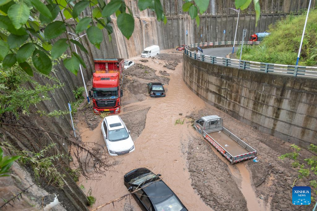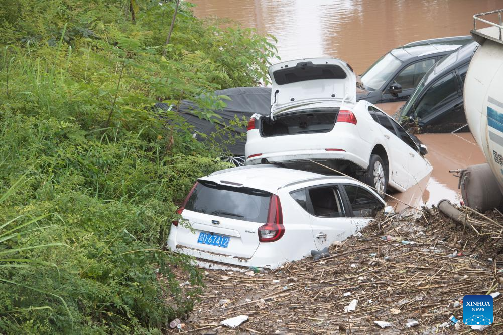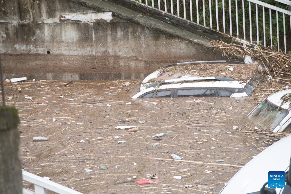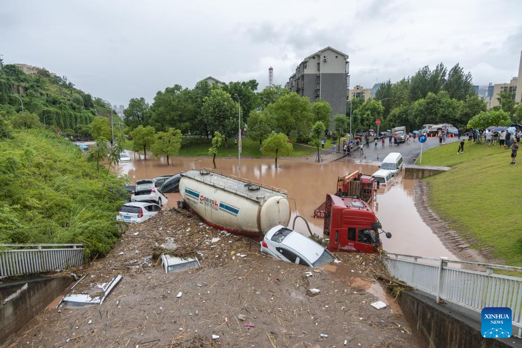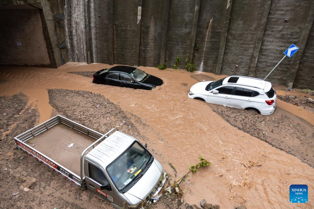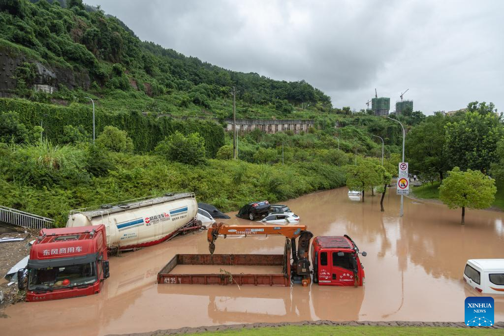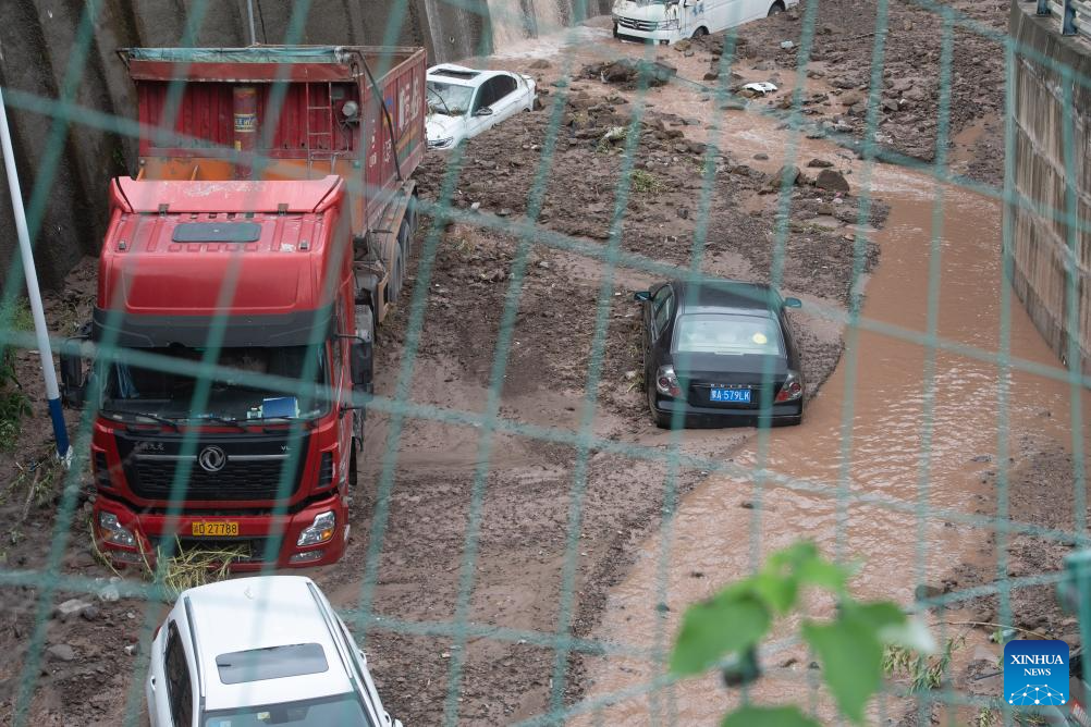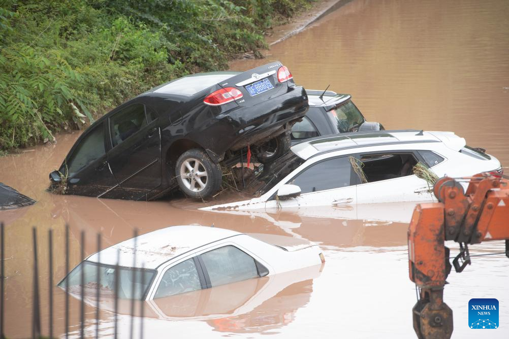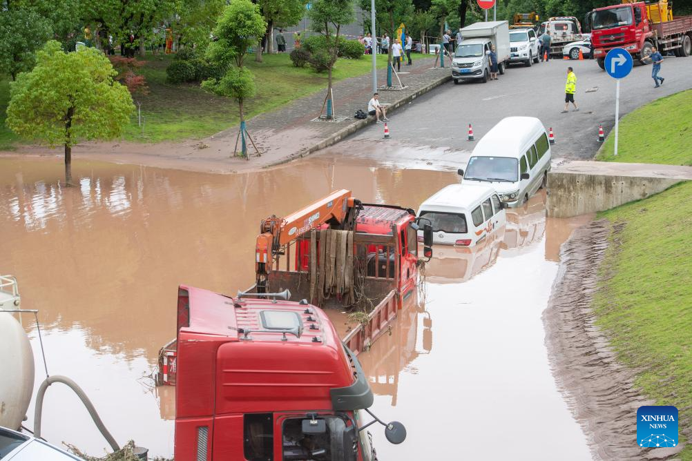 Vehicles parked on the side of a road are stuck in flood in Wanzhou District, southwest China's Chongqing Municipality, July 14, 2023. Rainstorms have battered 28 districts and counties of Chongqing since Thursday, with a record-breaking maximum daily rainfall of 227 mm recorded in the Wanzhou District, according to the local meteorological service.