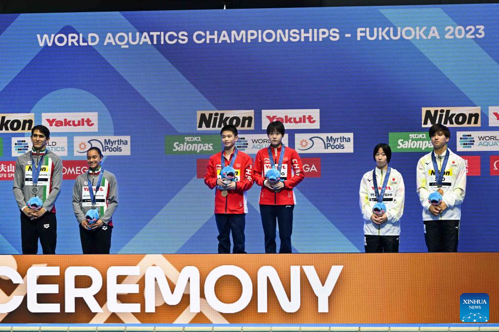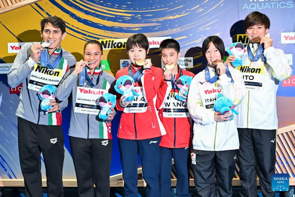 Gold medalists Wang Feilong (3rd R)/Zhang Jiaqi (3rd L) of China, silver medalists Jose Balleza Isaias (1st L)/Viviana Del Angel Peniche (2nd L) of Mexico and bronze medalists Itahashi Minami (2nd R)/Ito Hiroki of Japan pose for photos during the awarding ceremony after the mixed 10m platform synchronised final of the World Aquatics Championships 2023 held in Fukuoka, Japan, on July 15, 2023. (Xinhua/Zhang Xiaoyu)