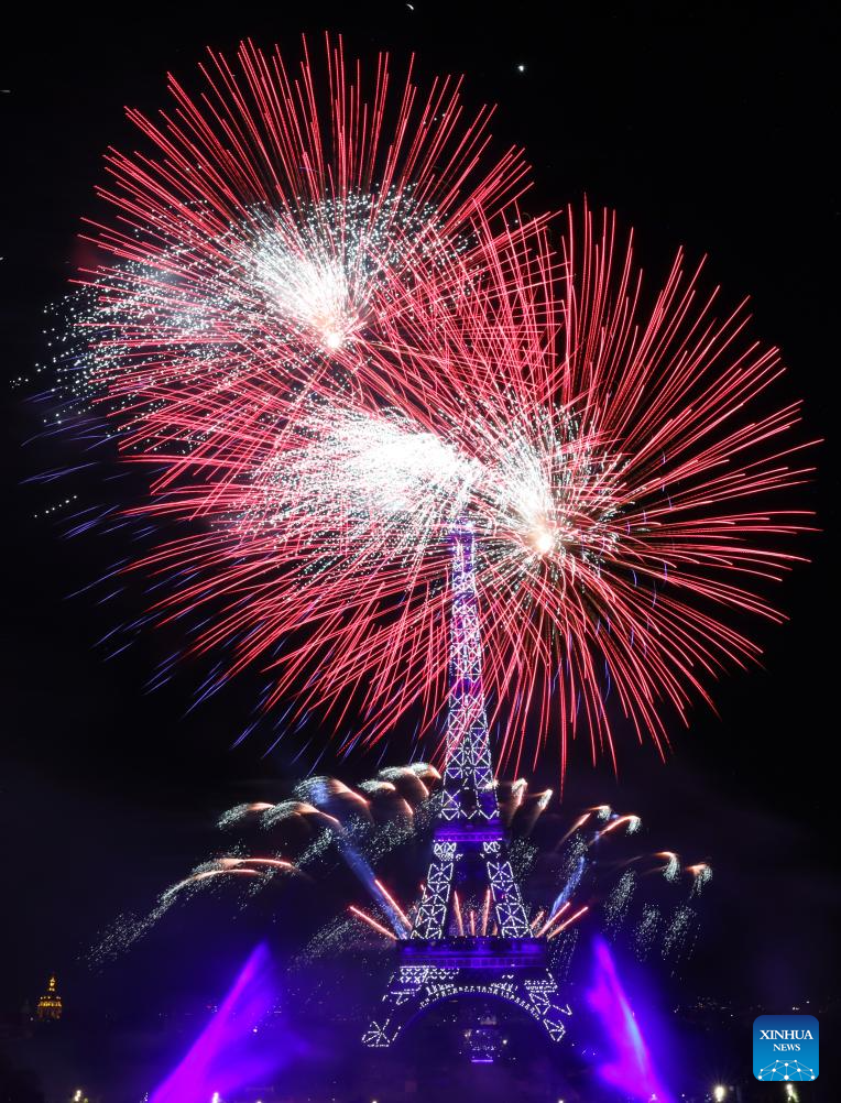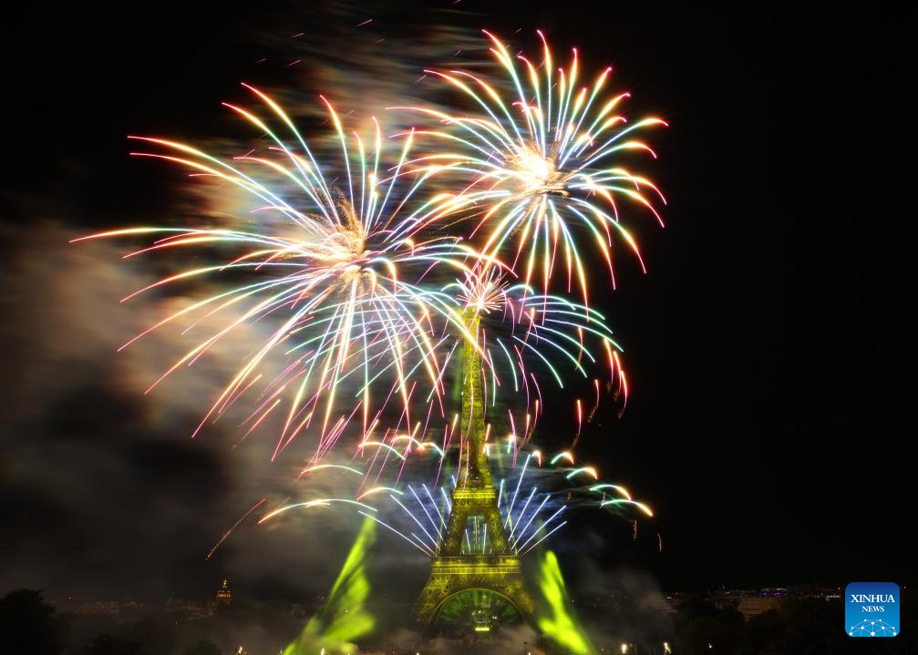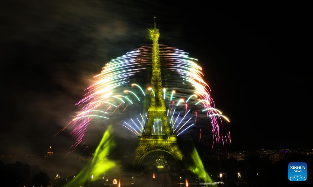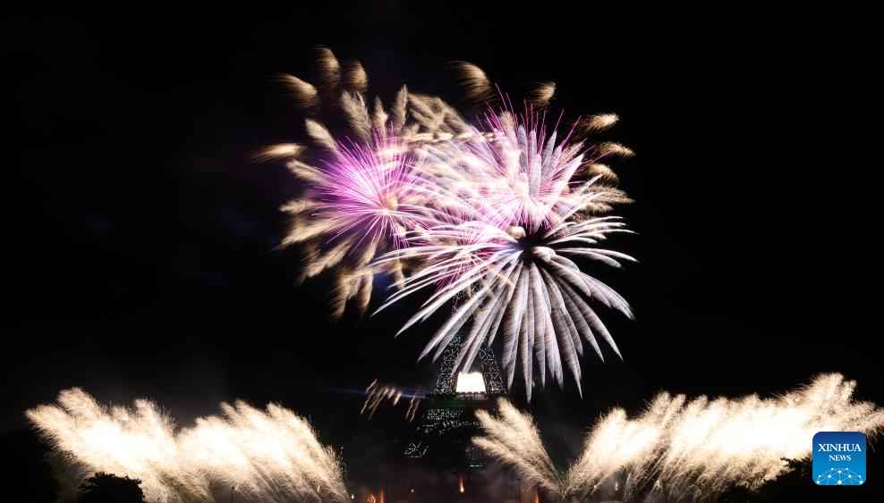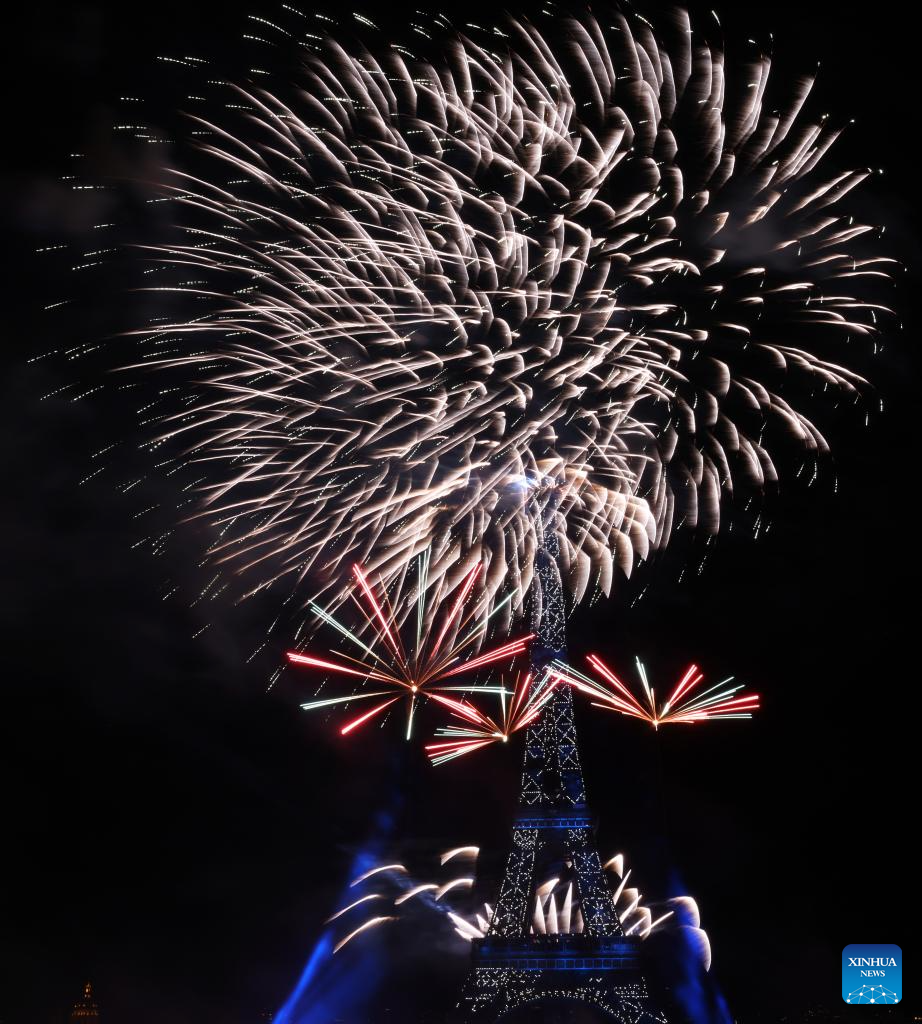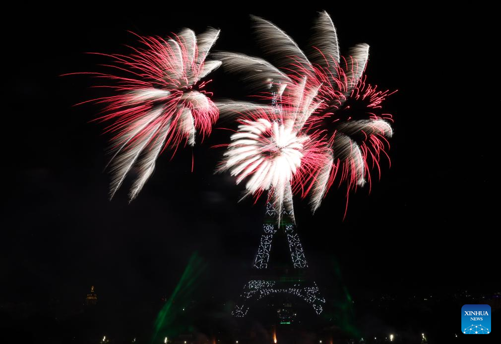 Fireworks explode near the Eiffel Tower during the Bastille Day celebrations in Paris, France, July 14, 2023. France held the celebrations of the French National Day, or Bastille Day, on Friday. (Xinhua/Gao Jing)